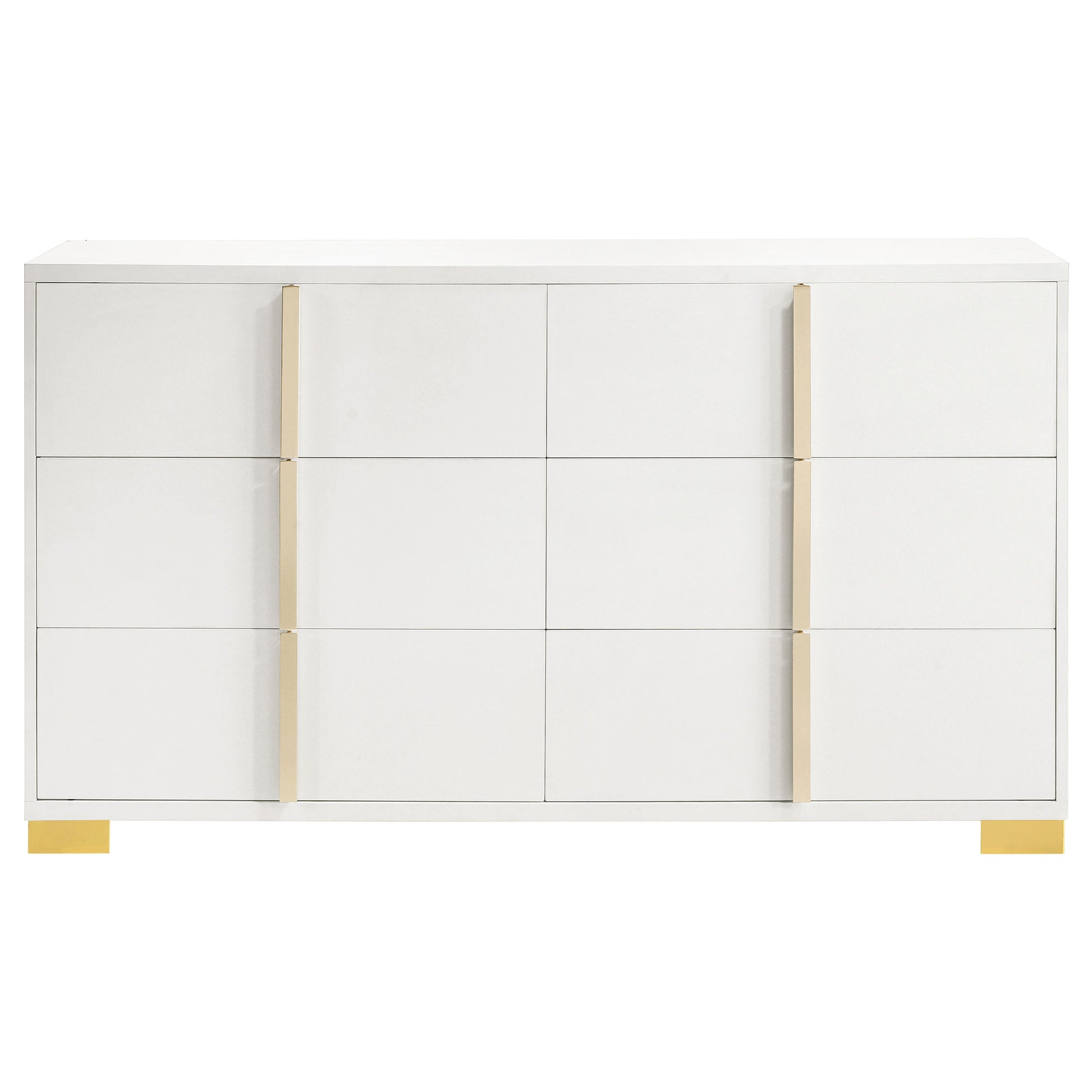 Cool white and warm gold create a compelling, modern ambiance for a stylish contemporary bedroom set. Centered on clean-lined silhouettes, the set features a modern bed complete with a squared headboard with built-in LED lighting that creates the right mood for relaxing evenings. The light is operated with a touch switch on each side of the headboard, assuring it's in easy reach. Storage pieces add roomy drawers with vertical gold pulls, and the dresser is topped in a framed mirror that adds to the airy feel of this set. Bracket feet complete the set, offering reliable stability and just the right hint of modern glam sophistication.