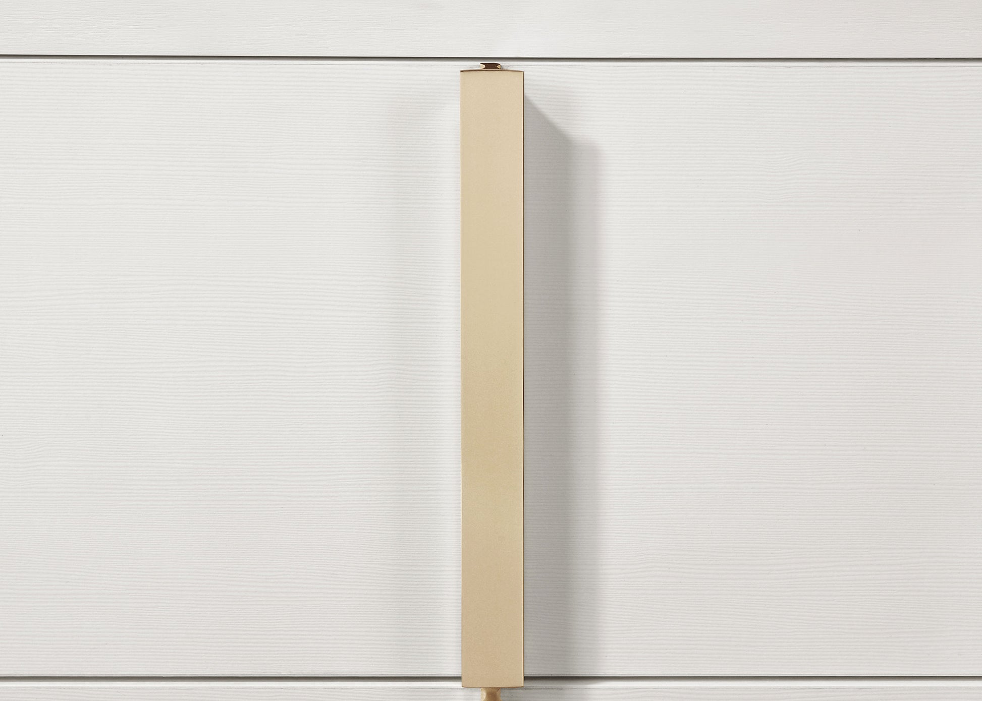 - Roomy drawers with vertical gold pulls and dresser topped with framed mirror