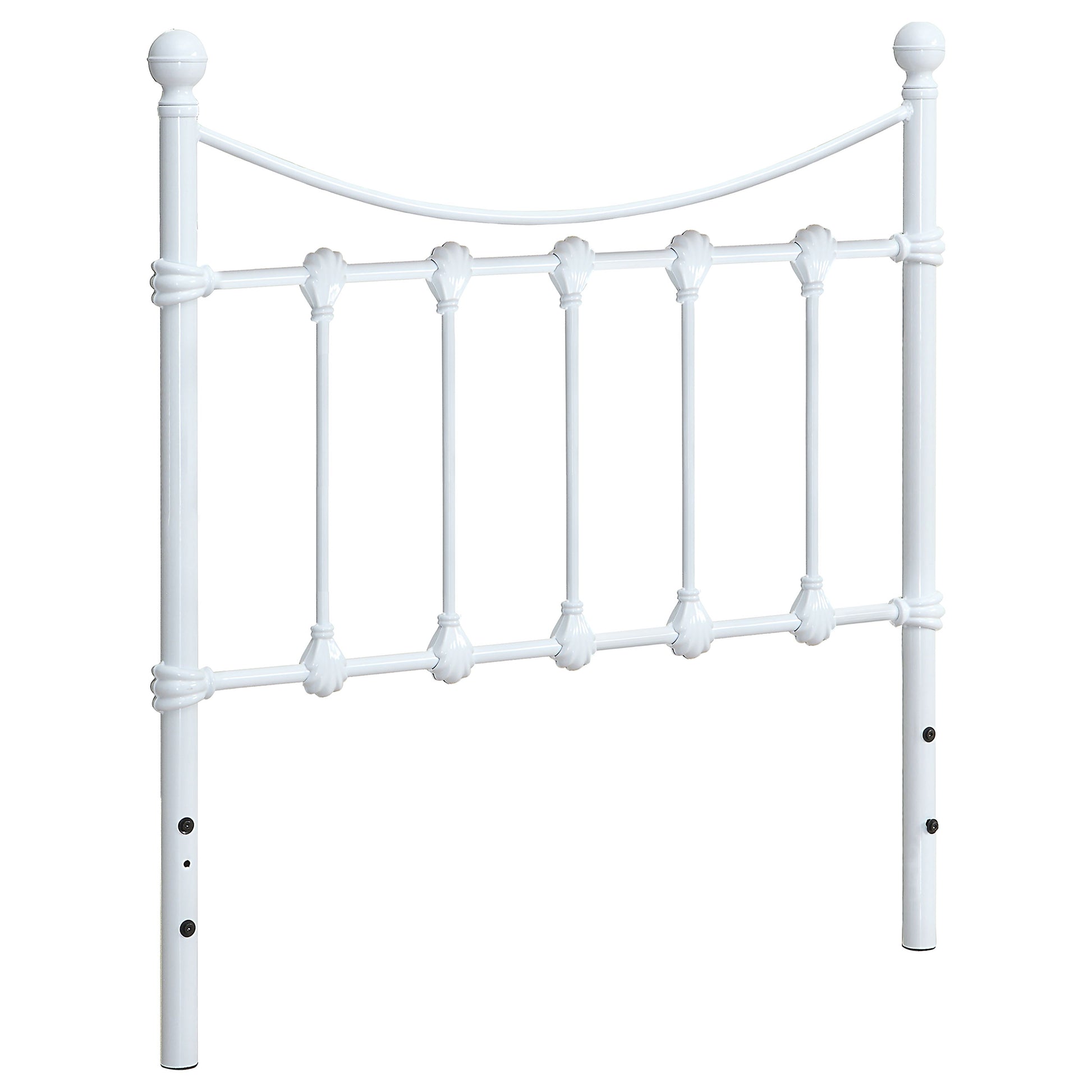 Add a sleek, distinctive flair to a metal bed frame with this metal twin headboard. It features a gentle U-shaped curve at the top with five vertical metal rods underneath for a clean, stylish appearance. Posts are topped by simple yet attractive round knobs. Finished in beautiful cottage white that matches any contemporary decor. Also available in full and queen sizes.