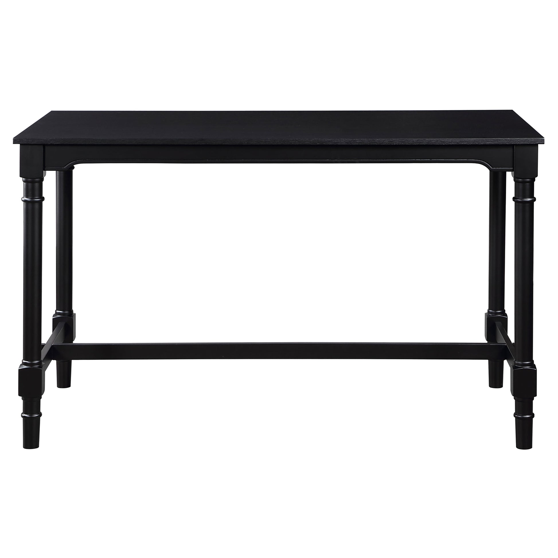 This 5-piece counter-height dining set is perfect for growing guest lists. Crafted from Asian hardwood, the rectangular table comfortably seats four and features a black finish and subtly turned legs for cottage inspired charm. The matching stools also have classic spindle legs in a black finish and comfortable oatmeal upholstered seats.