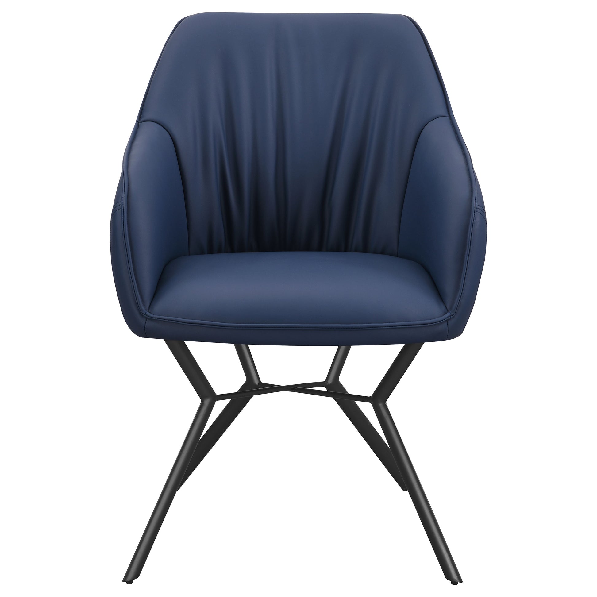 Retro vibes and mixed materials elevate the look of this contemporary dining chair. An upholstered seat features elegant, sloped armrests and a blue leatherette interior, wrapped with a diamond-quilted brown leatherette back fabric for a subtle contrast. Welt trim details and a loosely gathered back create a timeless, yet comfortable and casual touches. This dining chair rests also on a metal base with a gunmetal finish that offers a sleek, stylish look. Slim angled legs flare outward dramatically, offering up a vintage throwback.