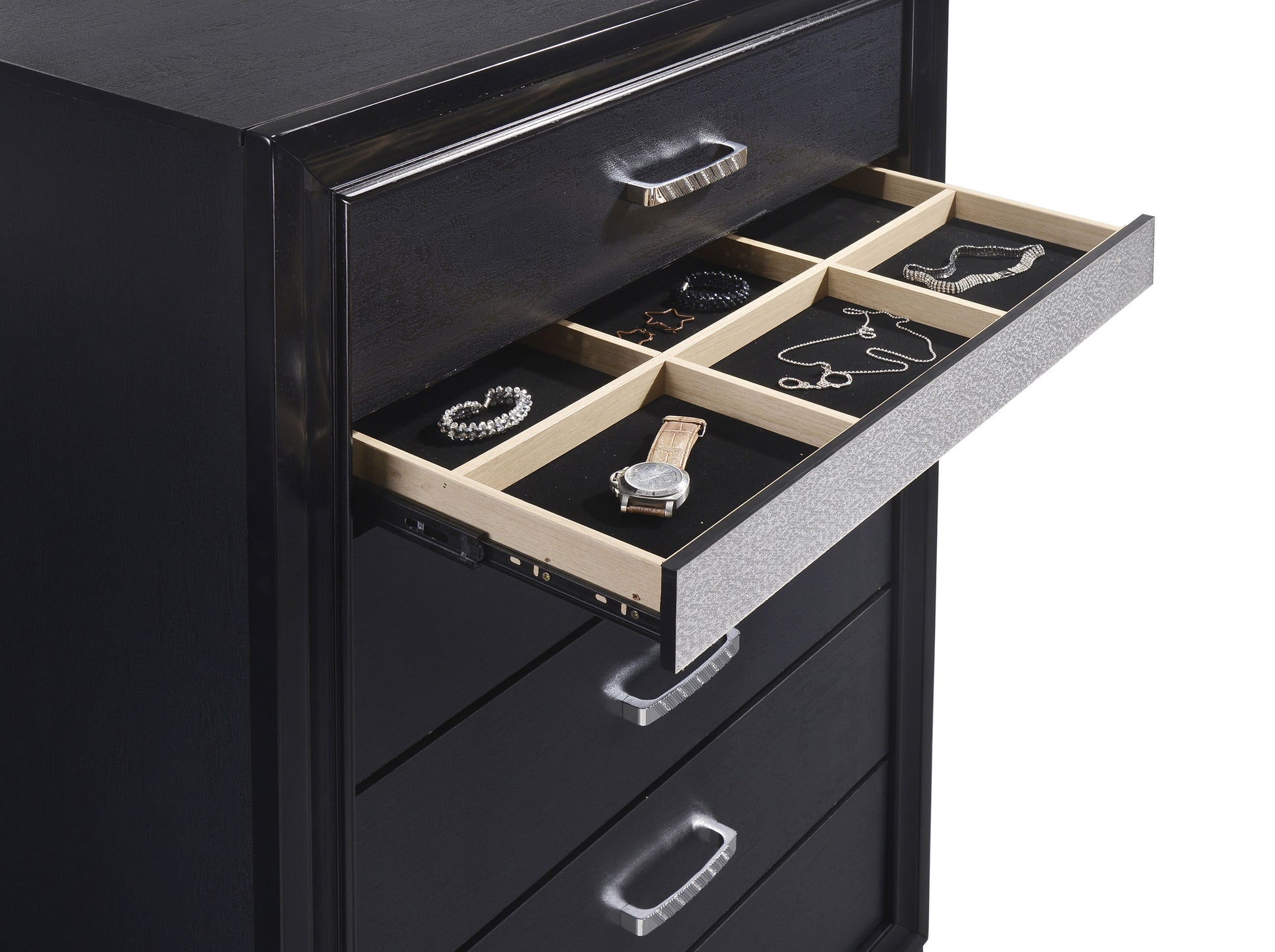 Create the bedroom of your dreams with this elegant, five-piece furniture set. Complete with a bed, nightstand, dresser, mirror and chest, it has all you need to complete your space. Each case piece includes a hidden jewelry drawer to keep valuables safe and secure. The two additional drawers built into the bed are ideal for storing shoes, bedding, clothing, and more. Each piece in this set is finished in a solid color for an appealing, monochromatic look.