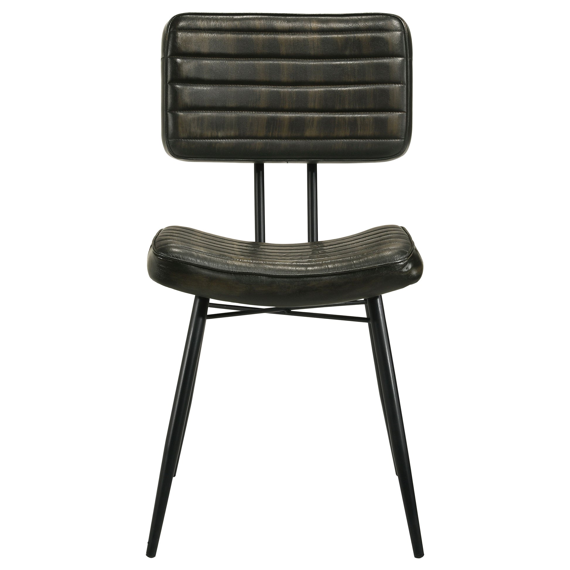 This set of two retro-inspired chairs make a charming addition to a boho-chic loft apartment or modern farmhouse style home. Each chair is supported by a flared and tapered metal legs in a deep black finish. The seat itself features padded backrests and seat cushions, each wrapped in a hand dyed goat leather in a dark espresso hue. Both the backrest and seat cushion offer vertical tufting details and long-lasting comfort and support. Available within the same Partridge collection is a matching dining table, bench, and dining server to tie a dining room together.