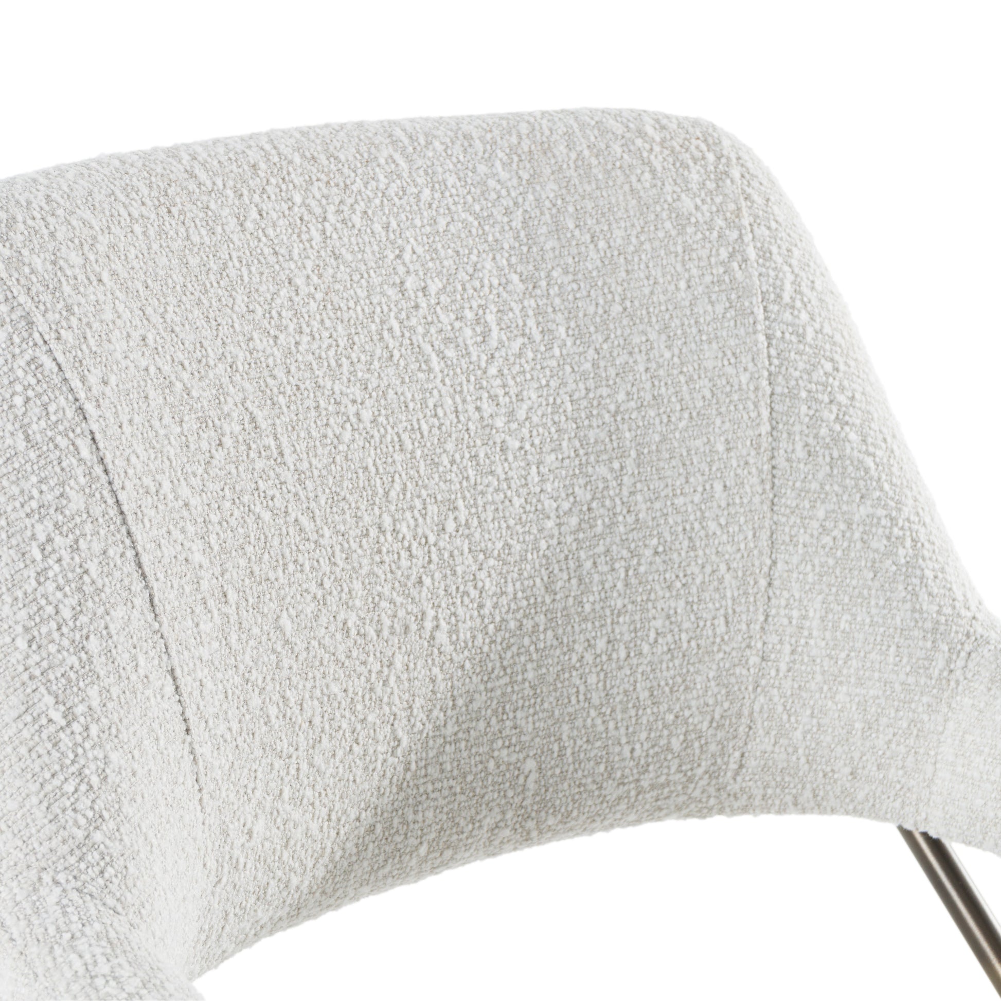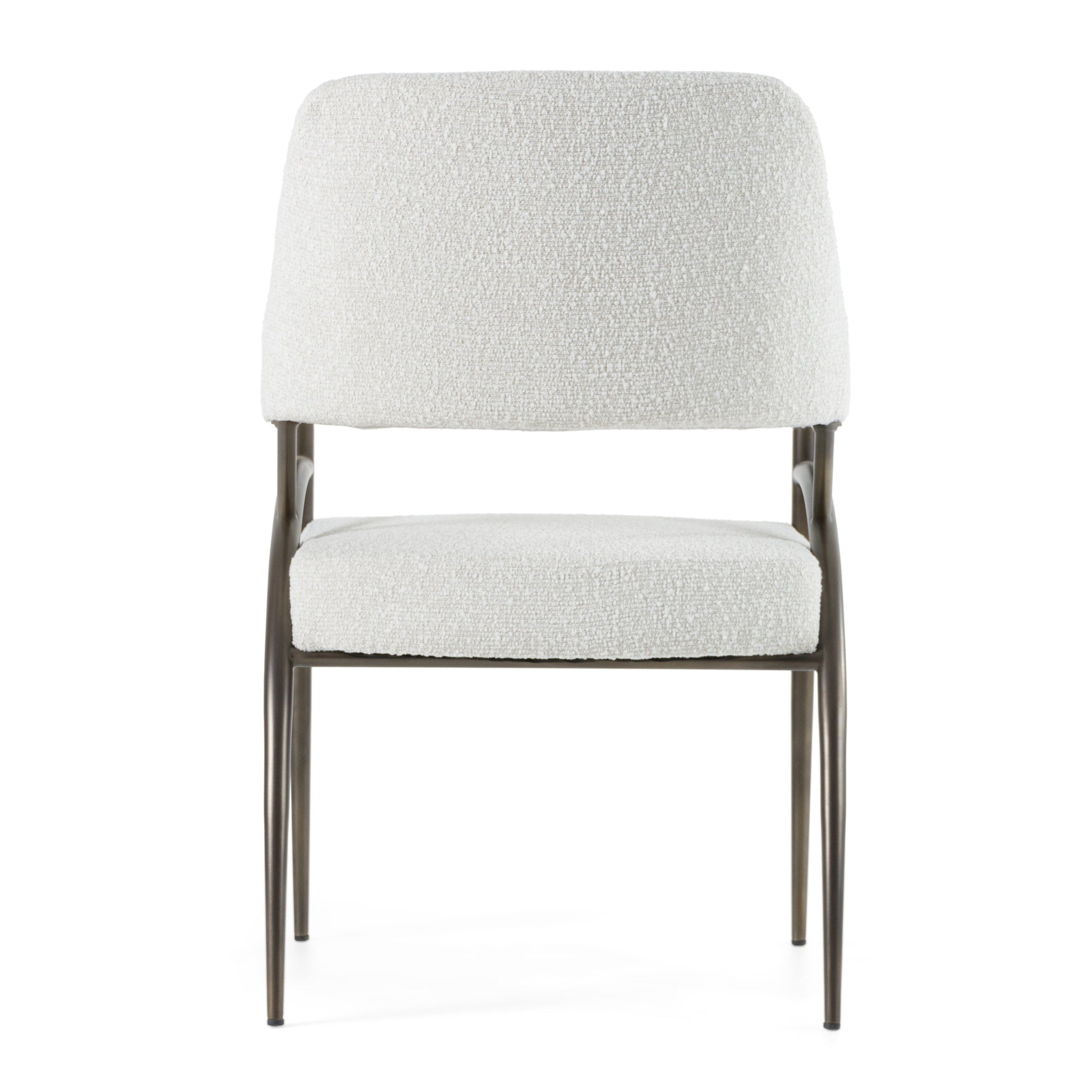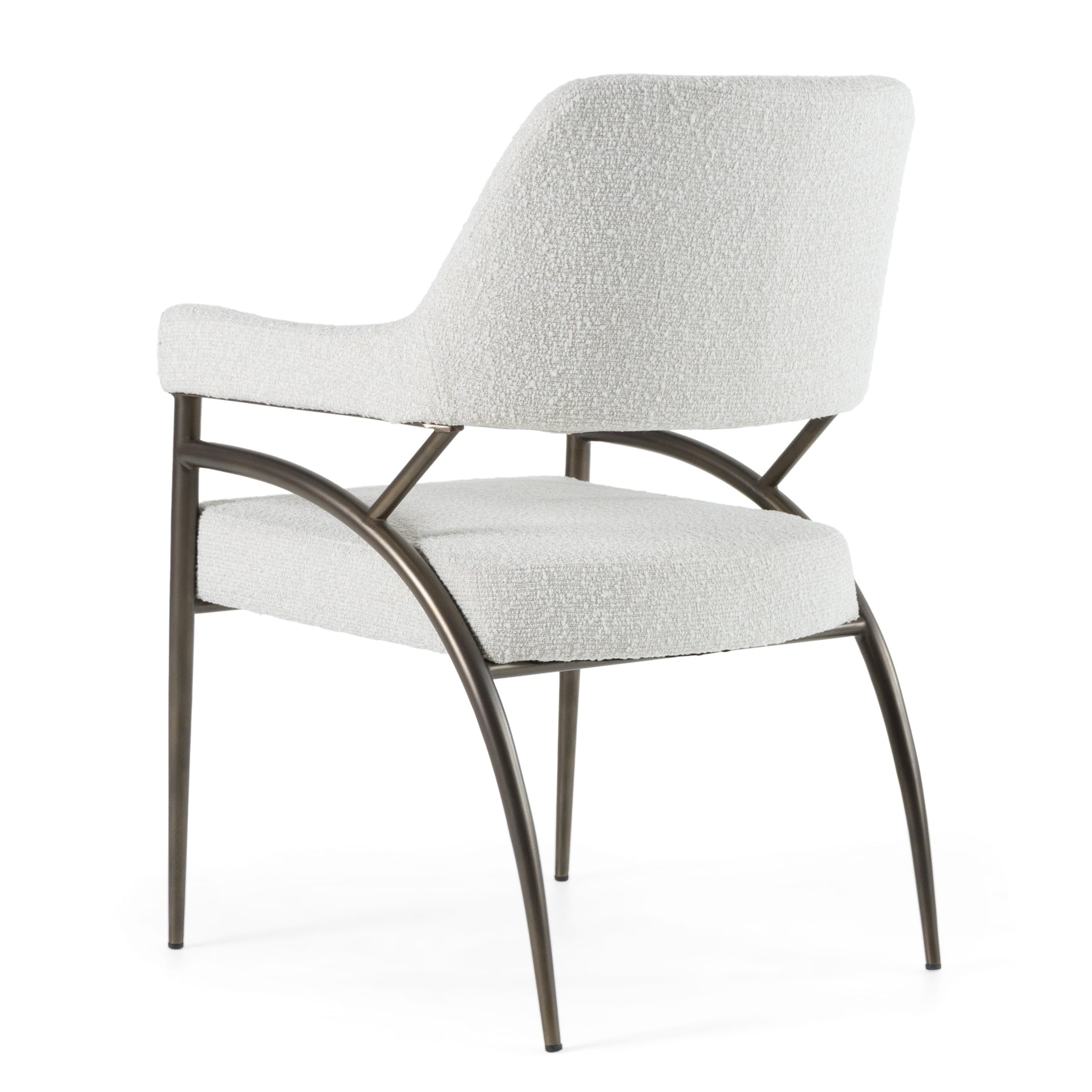 The Modrest Betty - Modern Off-White Fabric + Bronze Dining Arm Chair presents a striking balance between modern sophistication and understated luxury. Upholstered in soft, off-white polyester fabric, this chair envelops you in comfort while its bronze iron frame exudes a timeless elegance. The fluid lines of its cross-back design and elegantly tapered legs offer a refined yet contemporary touch, making it an ideal accent for chic, upscale dining settings. Perfectly crafted for those who appreciate the fusion of artistry and comfort, this piece effortlessly enhances the ambiance of a modern home, inviting guests to dine in unparalleled style.