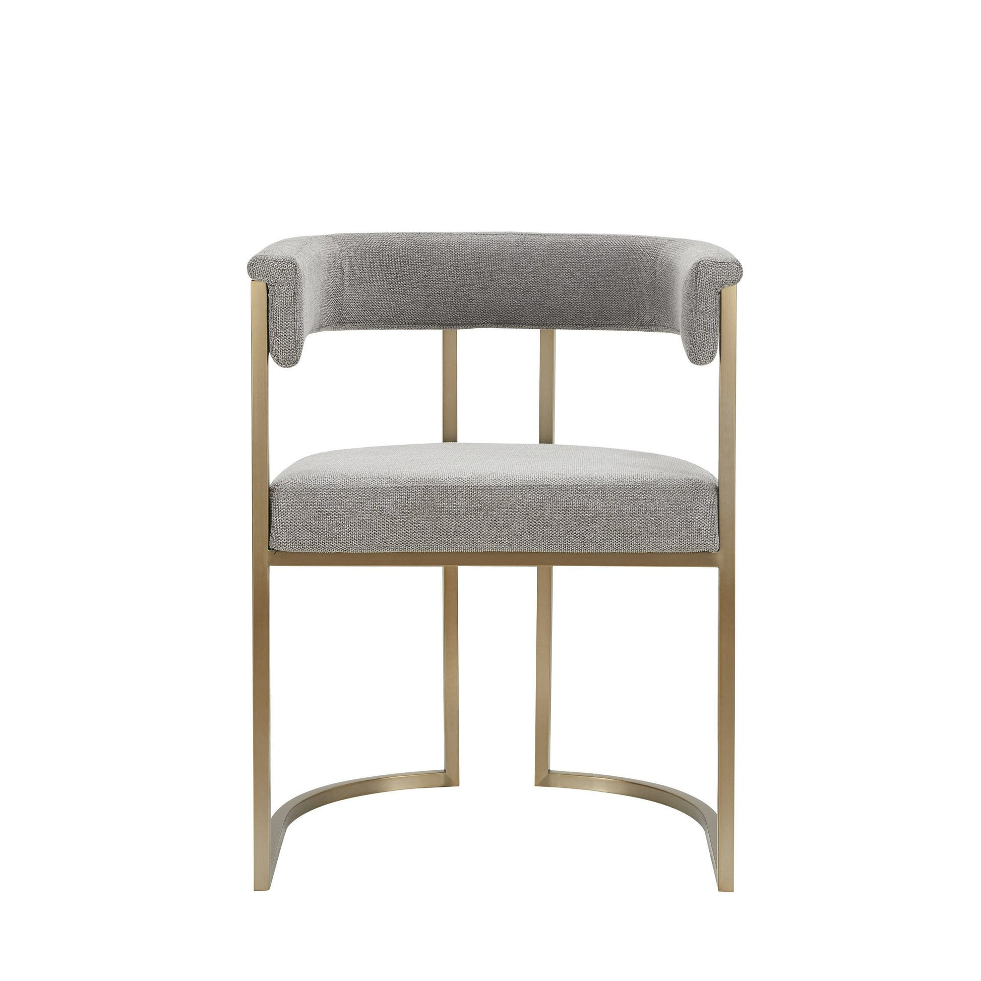 The Modrest Byron Dining Chair combines modern aesthetics with elegant touches. Upholstered in soft grey fabric, its comfortable, curved backrest provides excellent support while adding a touch of sophistication. The chair features a sleek antique brass frame, enhancing its contemporary feel and providing durability. With its unique design and stylish finish, this chair is perfect for elevating any dining space, effortlessly blending comfort with a chic, modern look.