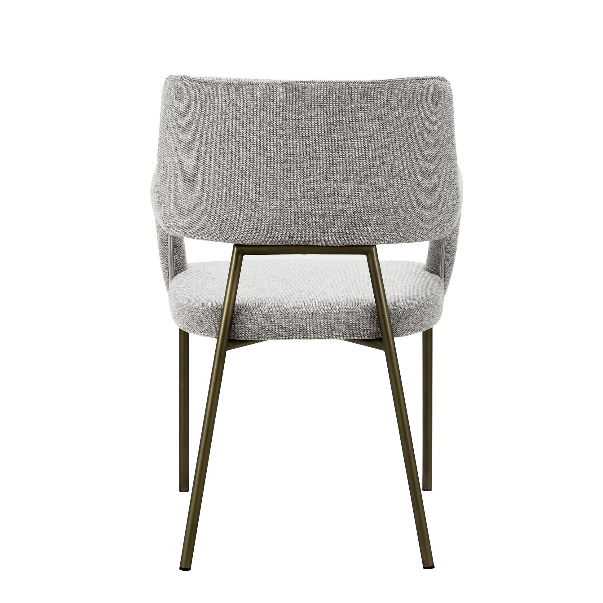 The Modrest Childers Dining Chair showcases a chic modern aesthetic with its soft grey fabric upholstery and sleek antique brass legs. Its ergonomic design features gentle curves and supportive armrests, creating an inviting seating option for any dining space. The combination of contemporary fabric and vintage-inspired metal adds a touch of sophistication and warmth, making it a versatile piece that complements various interior styles. This chair is perfect for enhancing your dining experience with both comfort and elegance.