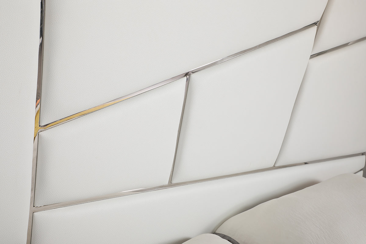 The White Chrysler Bed is a marvel of minimalistic design. The modern shapes and silhouette of this bed create angular and abstract shapes on the headboard. These shapes are upholstered in a gorgeous white vegan leather and accented by stainless steel inlay. The white upholstery surrounds the low-profile frame of the bed making the bed flow stylishly.