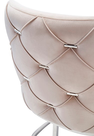 Gorgeous boudoir style chair with stainless steel frame with accent details and soft beige velvet upholstery.