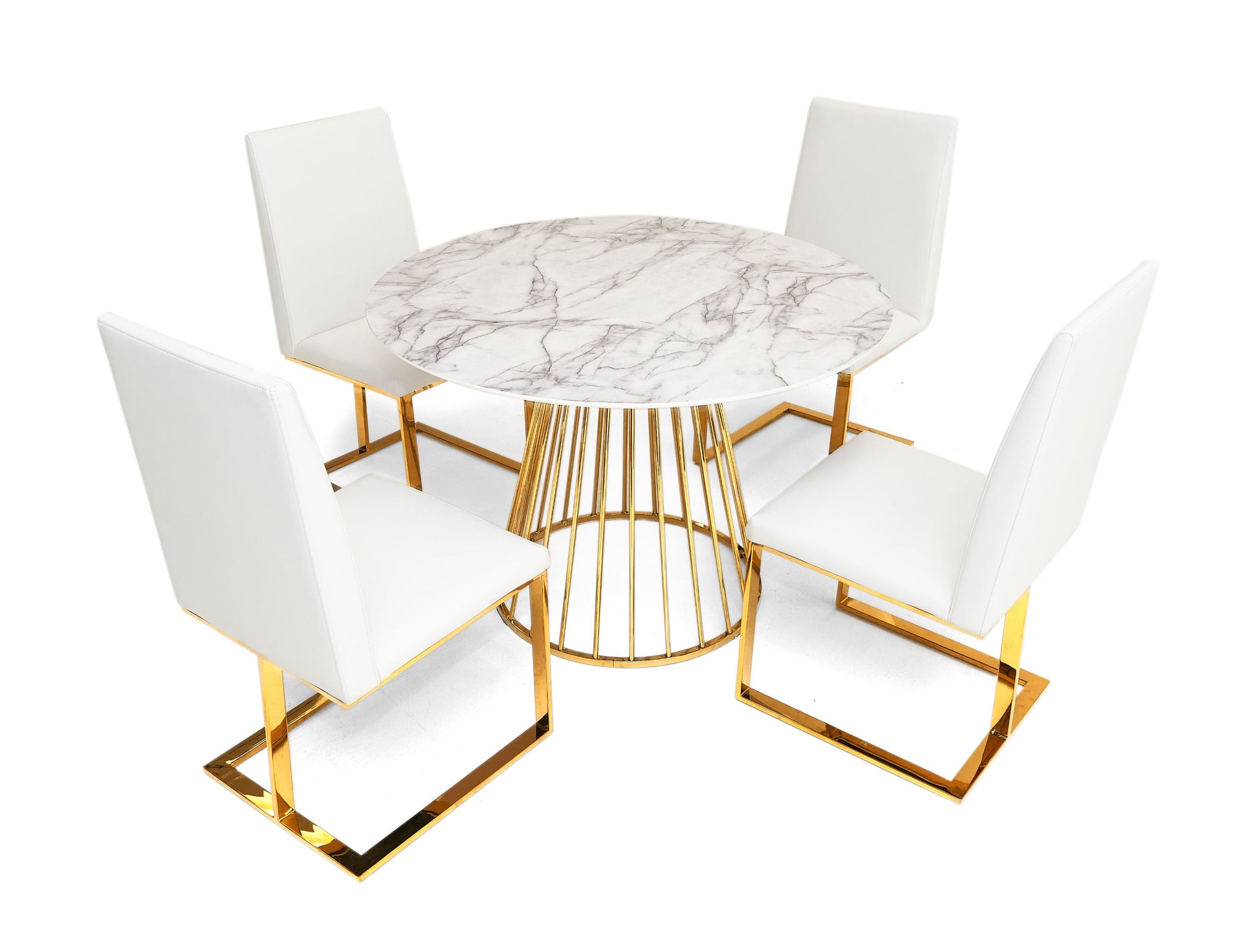 The Frankie is a contemporary modern dining chair that shines against and space. The beautiful white vegan leather upholstery is juxtaposed by the bright gold exposed metal that is sure to add luxury and class.
