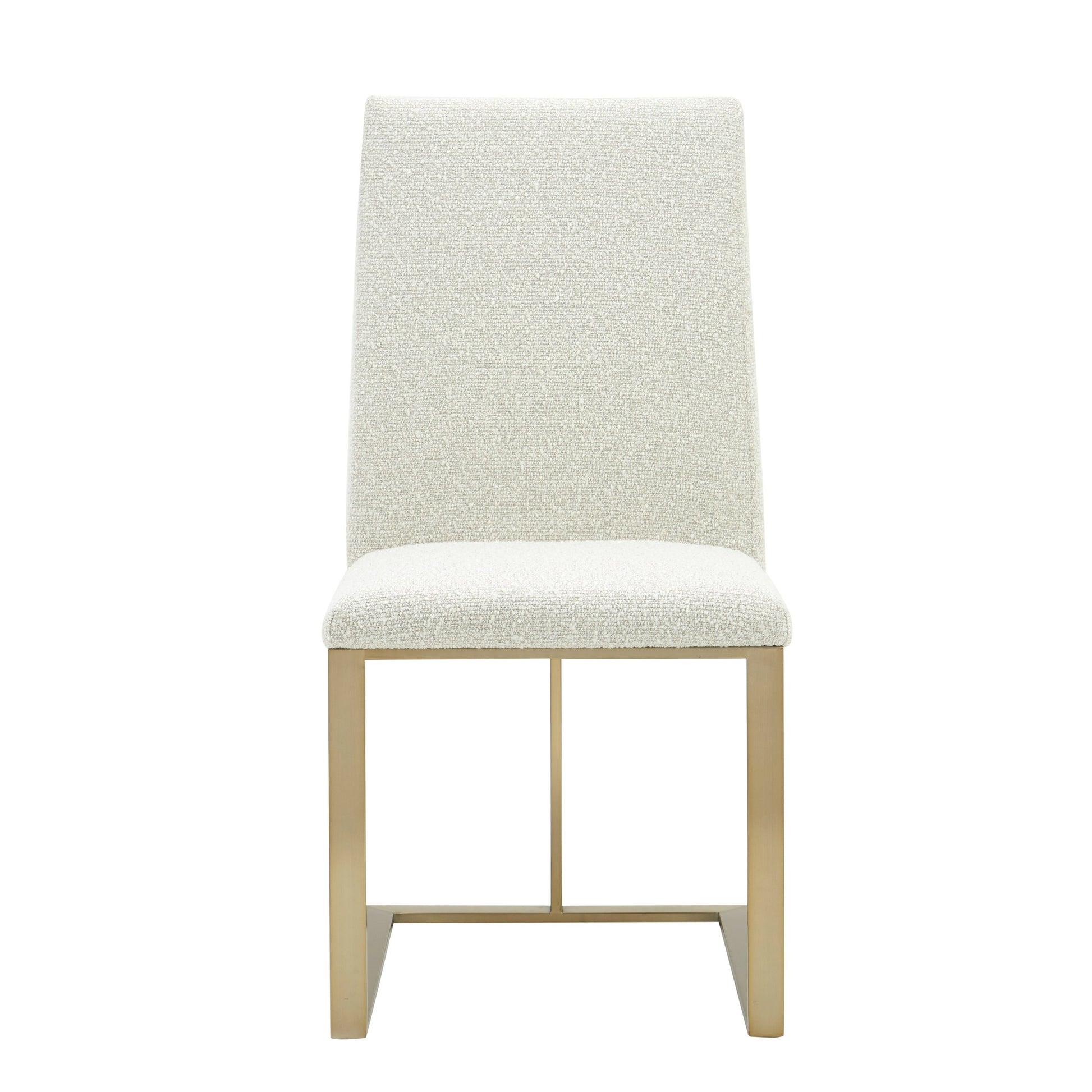 The Modrest Frankie Dining Chair exudes modern elegance with its off-white fabric upholstery and sleek antique brass legs. Its minimalist design features a tall backrest and a comfortably cushioned seat, making it an ideal addition to contemporary dining spaces. The textured fabric adds a subtle visual interest, while the brass frame provides a touch of sophistication. This chair harmonizes style and comfort, perfect for elevating your dining experience.