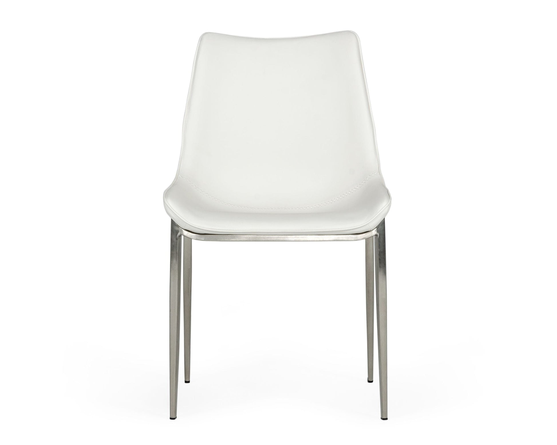 The Fraiser Dining Chair has a modern white bucket seat with stainless steel legs and is an exemplary example of modernism. This chair is perfect for an artsy dining room in a modern brightly lit home.