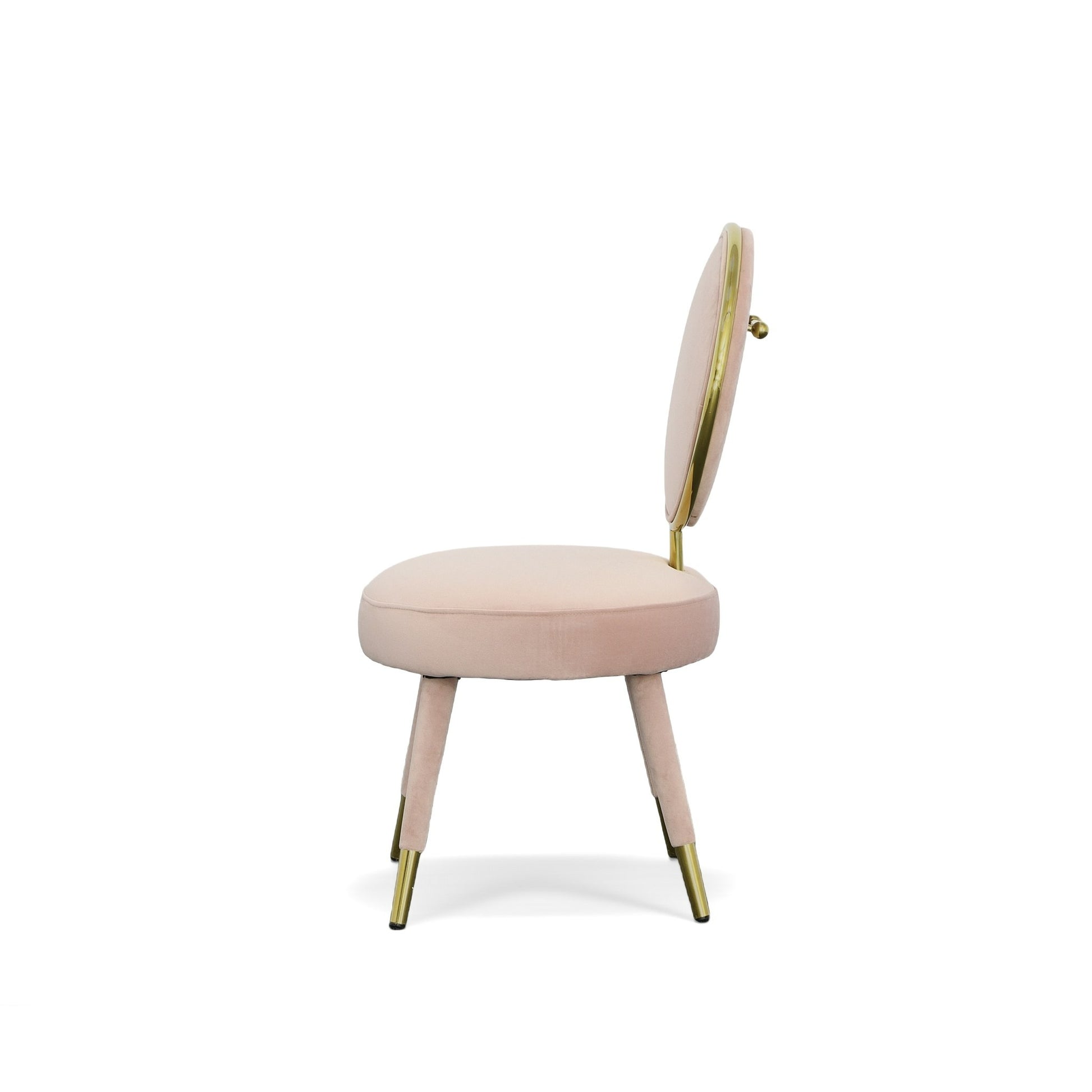 The Haswell Accent Chair is a stylish glam piece that brightens any space it enters. The round shape and gold accents take a mod look and elevate it. The bold pink velvet upholstery wraps around the circular silhouette while the gold chrome frames the back and caps the legs. Sure to emphasize any space.