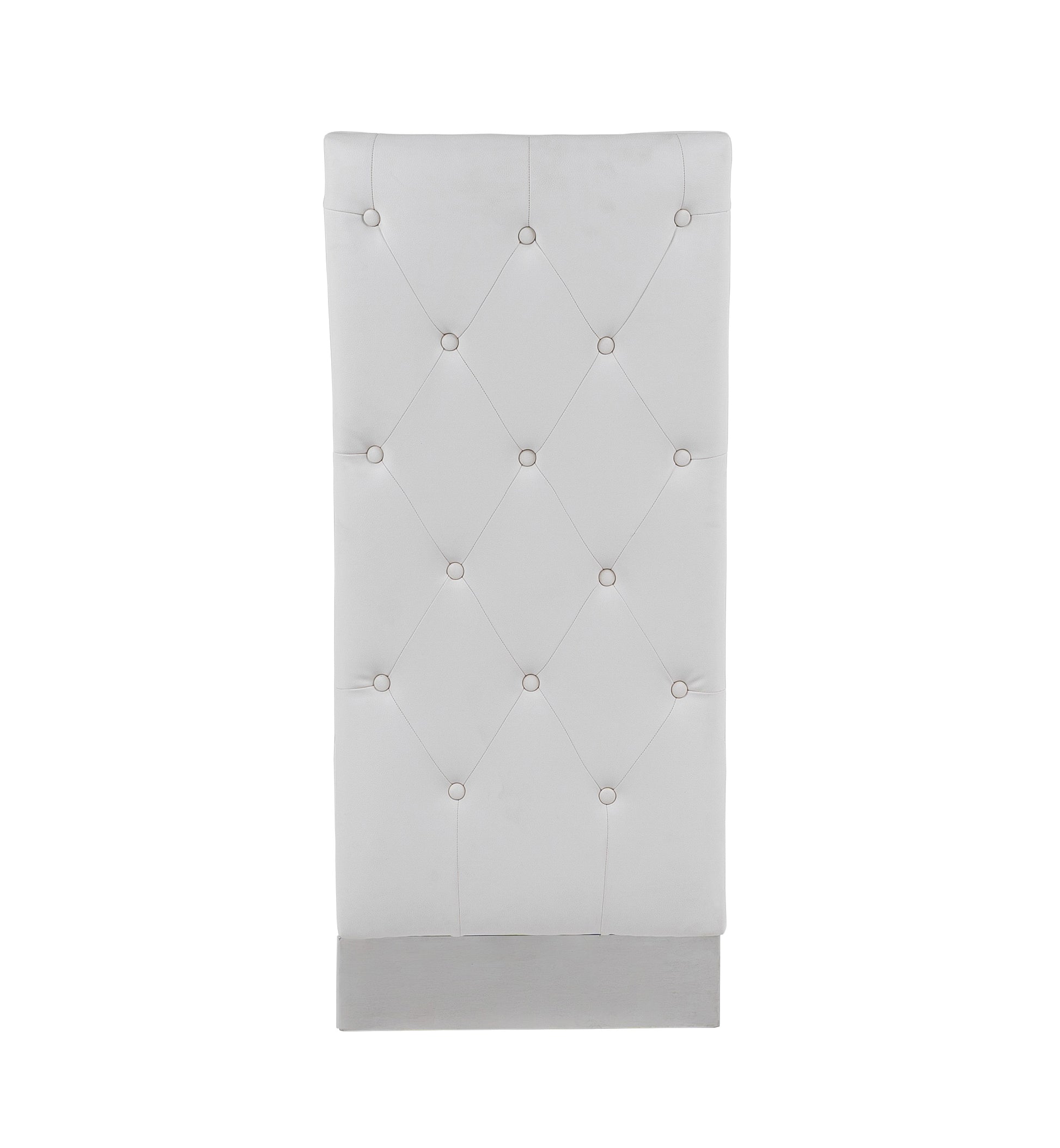 Get that chic and posh dining room with the Modrest Kilson Modern White Leatherette & Stainless Steel Dining Chair. Available in a set of 2, this pair features a foamed full seat and a floor-length back that sits on a metal base. Adding to its alluring looks are button tufts that adorn the rear side of the backrest. Dainty white leatherette upholstery covers the seat and backrest. Robust polished stainless steel base and tapered front legs provide steady support. The modern dining chair lends a retro feel to your modern home.