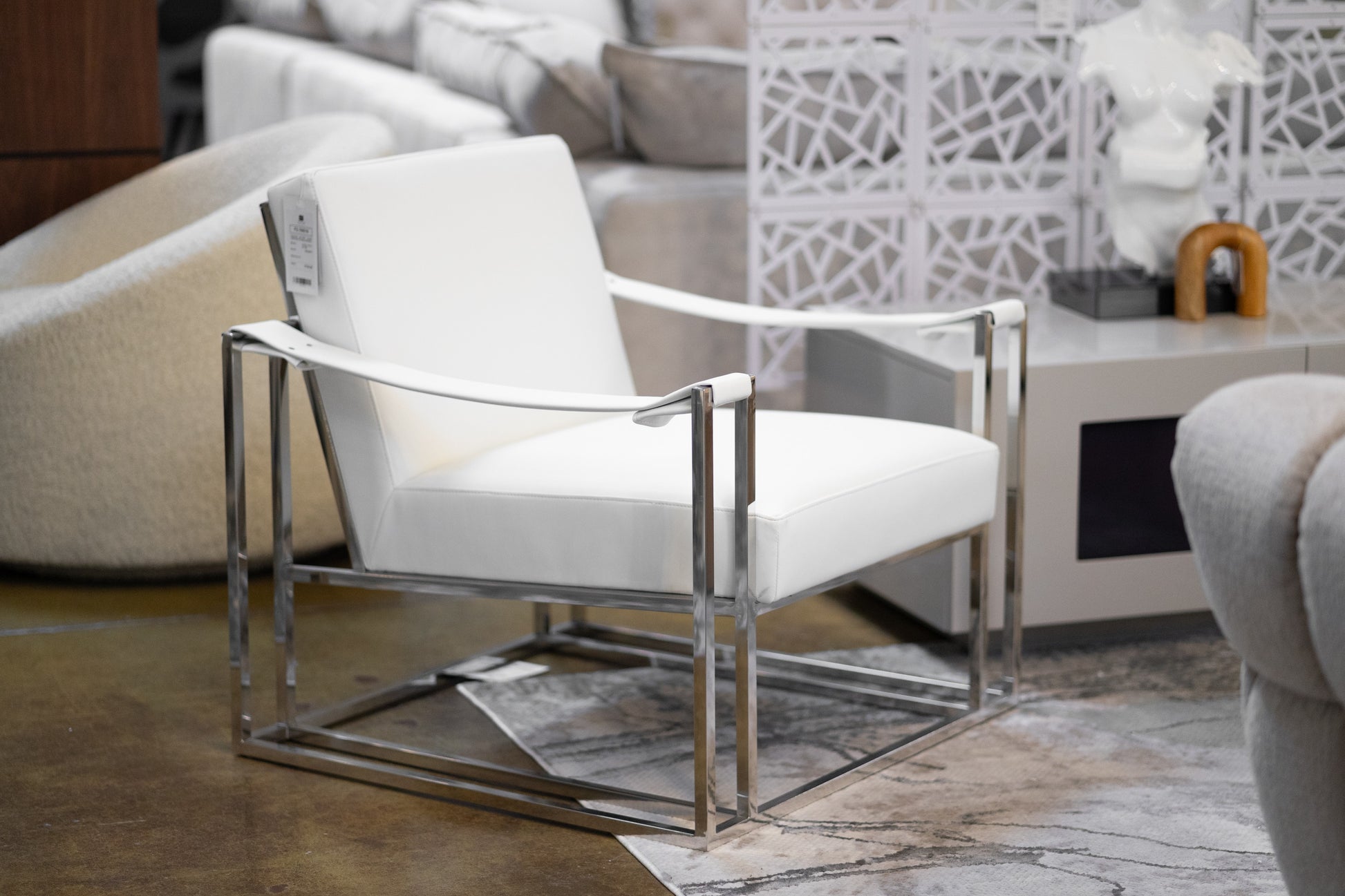 Introduce a novel seating piece for your modern home. The voguish Modrest Larson Modern White Leatherette Accent Chair is a must-have for your mid-century space. Built with a two-fold brushed stainless steel frame, it is upholstered in luxurious white leatherette that makes an outstanding contrast of textures. With a densely padded back and seat and a sturdy frame, this modern white leatherette accent chair creates a striking contemporary design statement.
