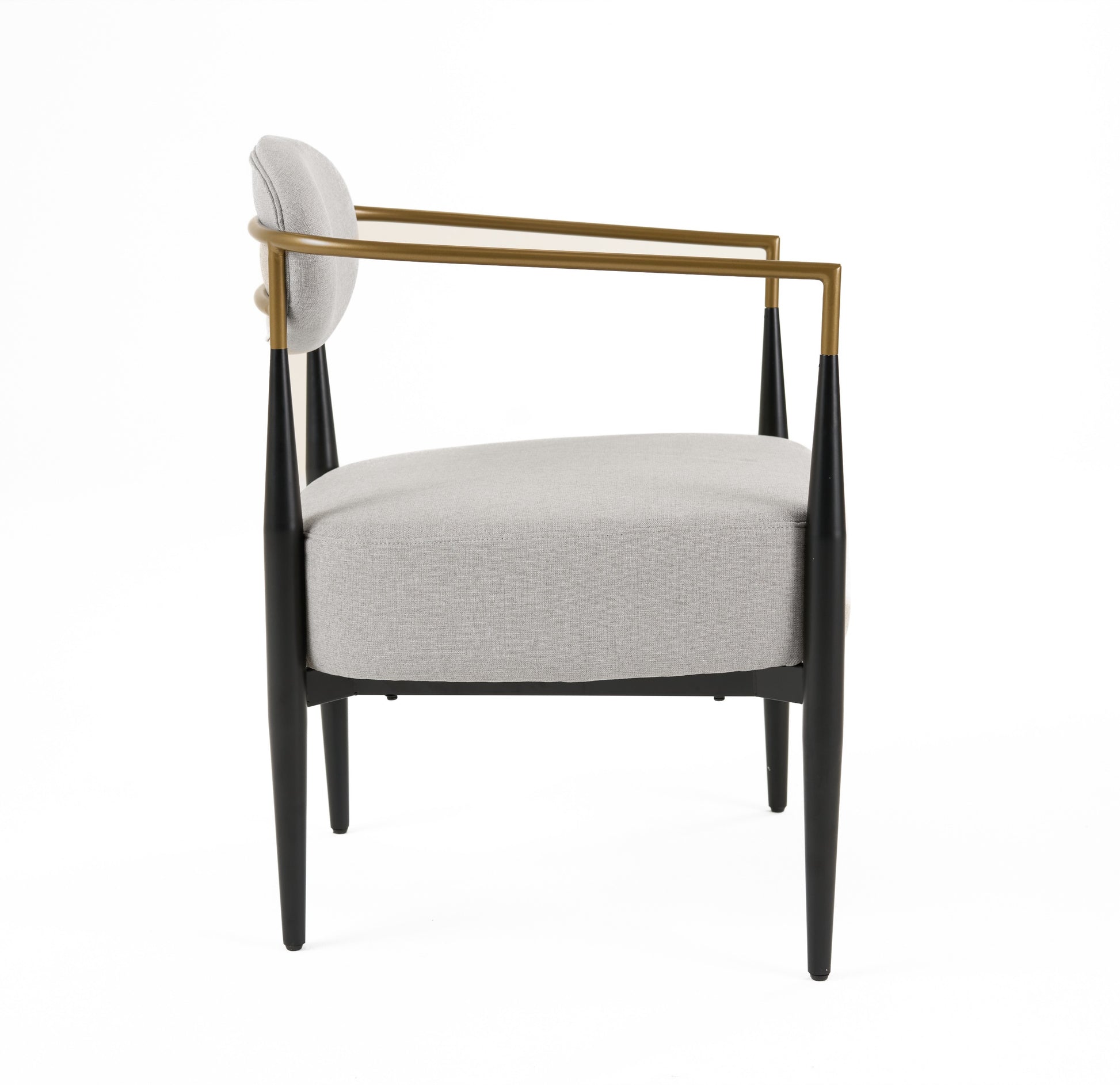 The Modrest Liberty Accent Chair is a stunning piece that combines modern elegance with comfort. Featuring a light grey fabric upholstery, its oval backrest and seat invite relaxation. The chair's sleek black legs and gold-accented armrests add a touch of sophistication, enhancing its contemporary appeal. Perfect for various décor styles, this chair serves as an eye-catching accent in any room, blending functionality with chic design.
