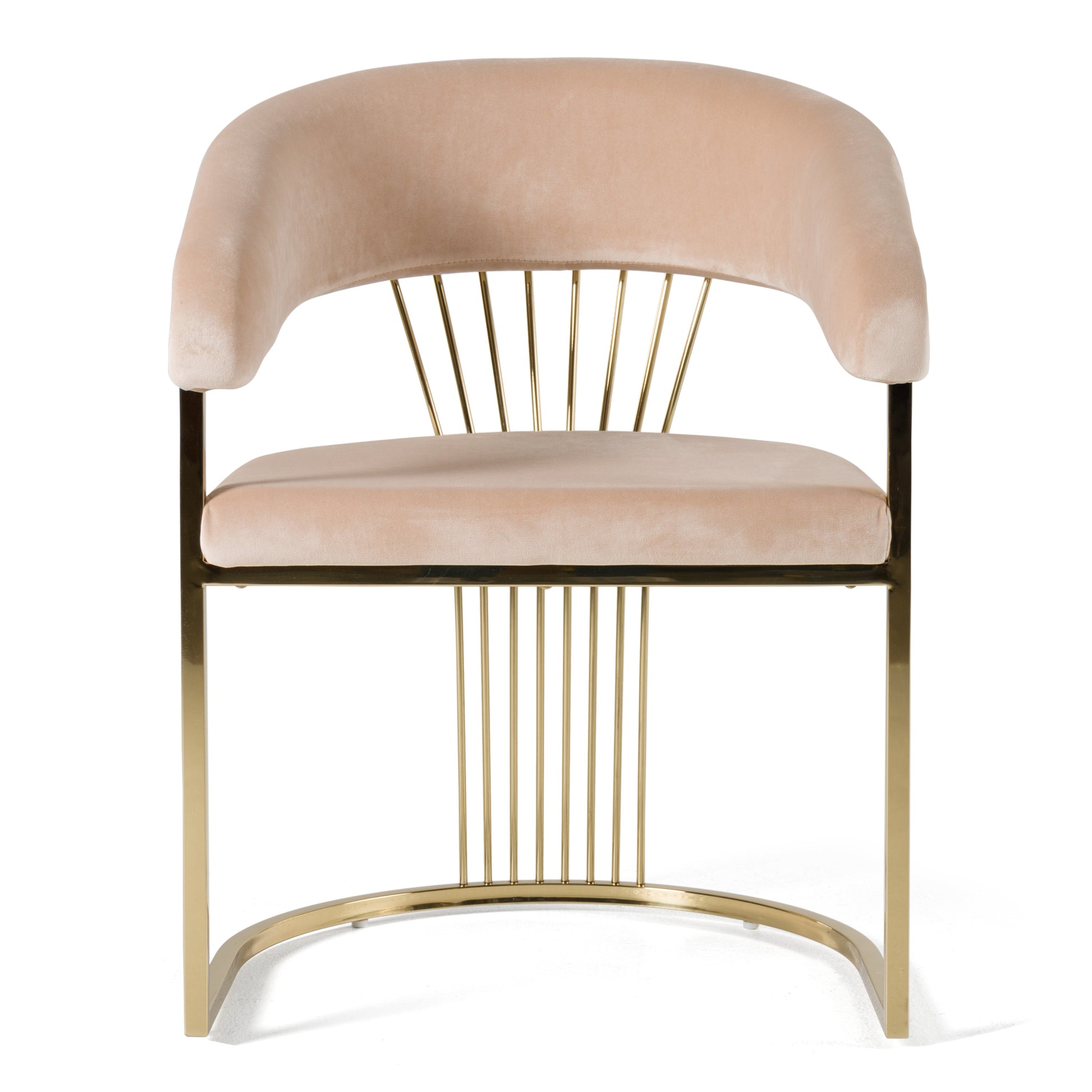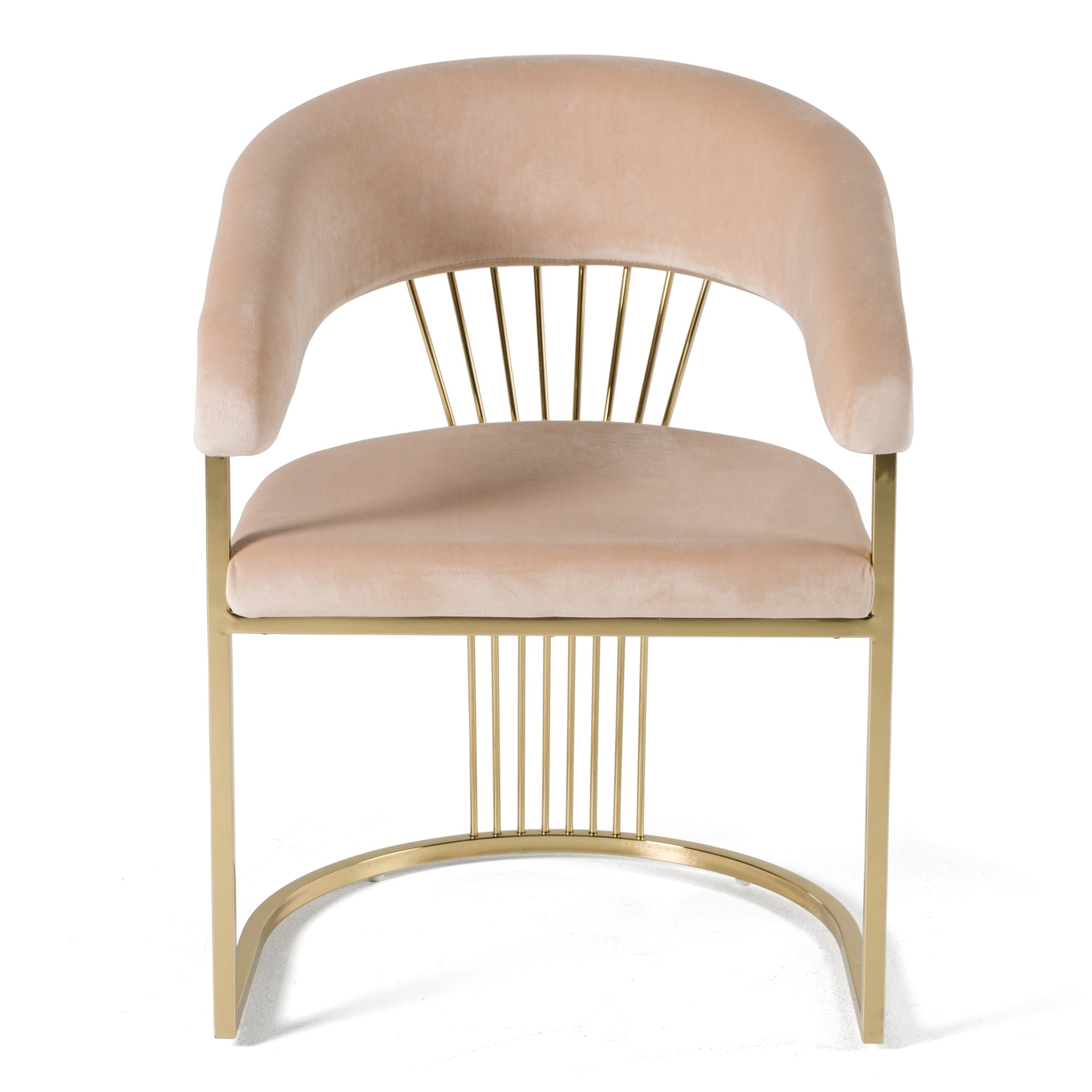 The Modrest Linda Modern Beige Velvet and Gold Dining Chair is a stunning piece of furniture that effortlessly combines style and comfort. Crafted with a sleek and contemporary design, this chair features a plush beige velvet upholstery that exudes elegance and sophistication. The gold-finished metal frame adds a touch of opulence and glamour to any dining space. With its ergonomic shape and generously padded seat, this dining chair ensures optimal comfort during meals and gatherings. Its sturdy construction guarantees durability and longevity. The Modrest Linda Dining Chair is the perfect choice for those seeking a luxurious and modern seating option that enhances the overall aesthetic of their dining area.
