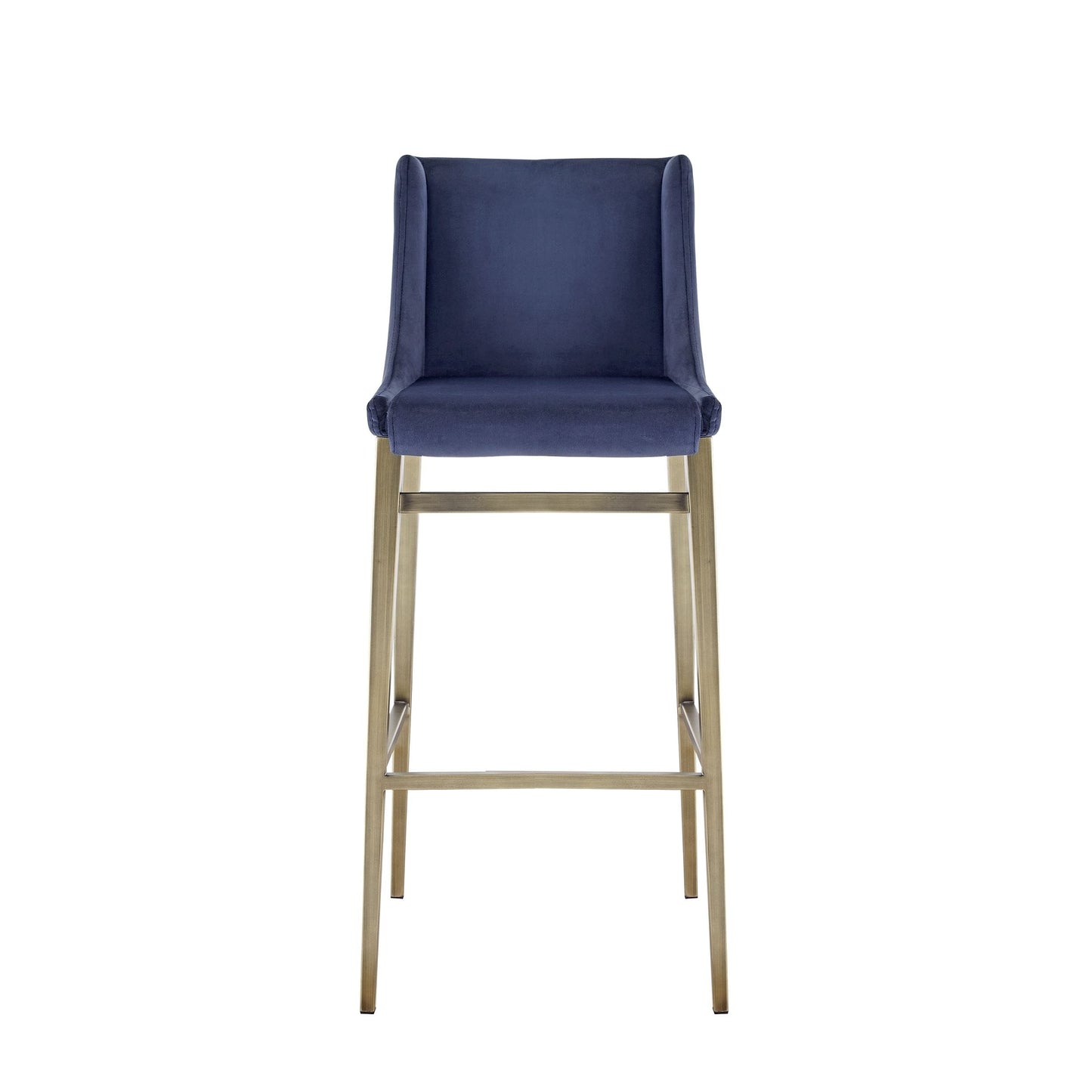 The MiMi Barstool is the perfect contemporary bar stool for your home. The lovely blue velvet upholstery encompasses this wingback style seat. The brushed antique brass metal frame adds an industrial flair and makes up the entirety of the frame. Perfect for a modern home.