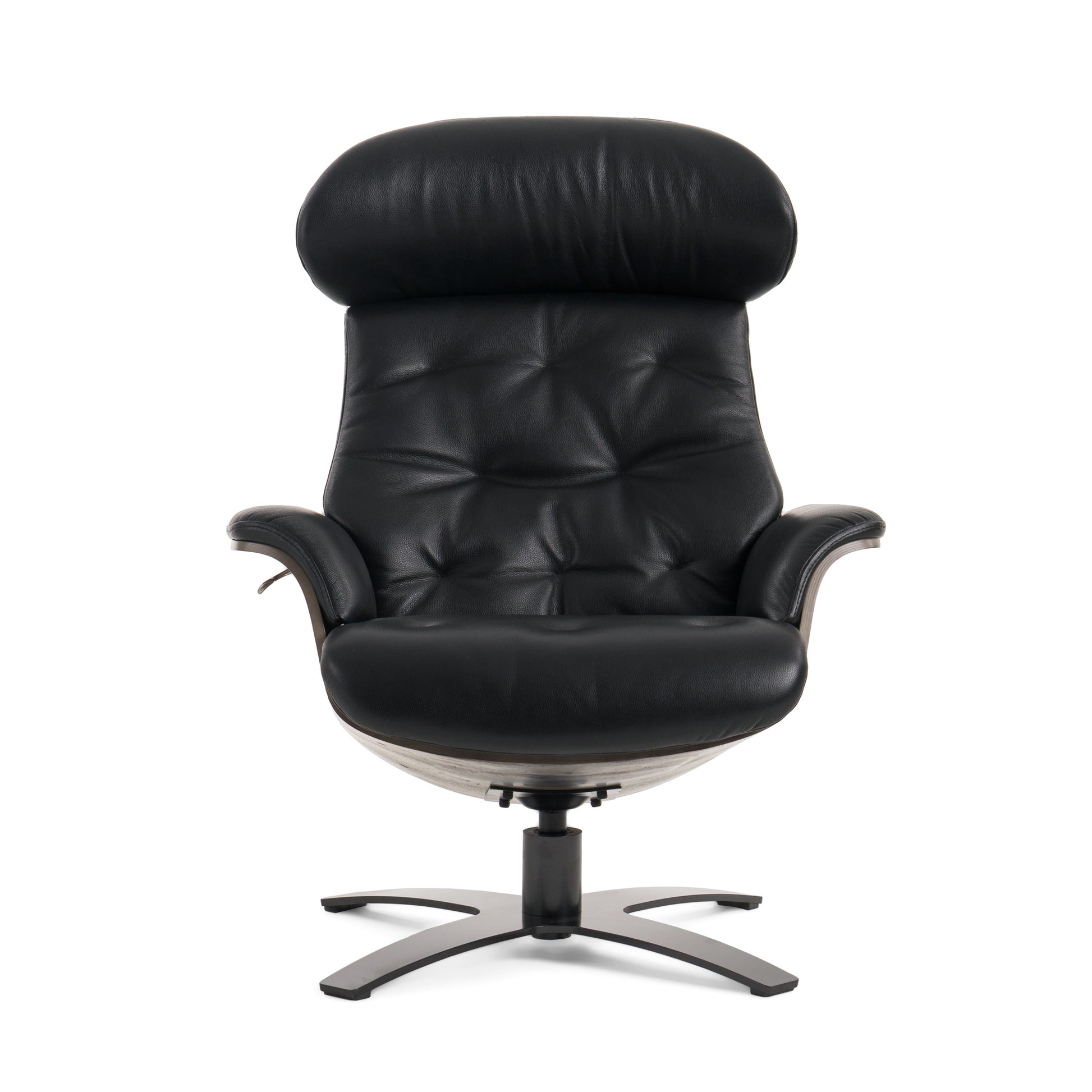 The Modrest - Nowak Modern Black Lounge Chair & Ottoman Set is a stylish and comfortable addition to any living space. The set includes a chair and an ottoman, both upholstered in genuine black leather. The chair features a metal frame, wood veneer back, fixed armrests, and a full-circle swivel. With an adjustable seat height and a sleek design, this lounge chair and ottoman set is perfect for relaxation and modern aesthetics