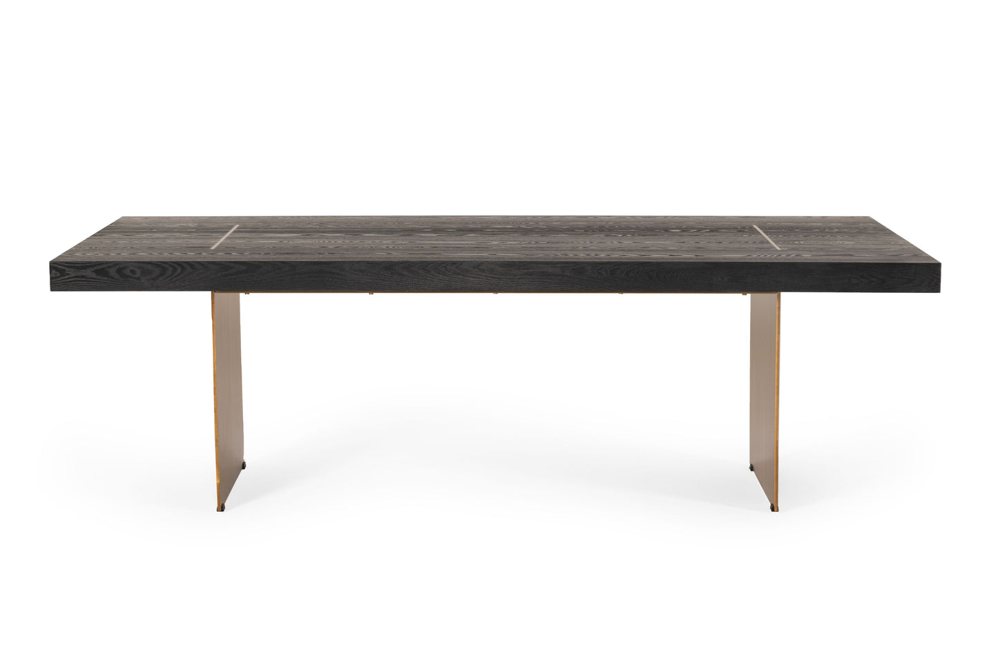 The Perret Dining Table is a beautiful item for your dining room. The modern deep black ash veneer top is adorned with gold stainless steel inlay that pops against the deep wood. The trestle legs are matching the gold stainless steel and adds glam luxury to the rough textures of the wood. Pair with the Perret Buffet and Dalton Dining Chairs for a complete look.