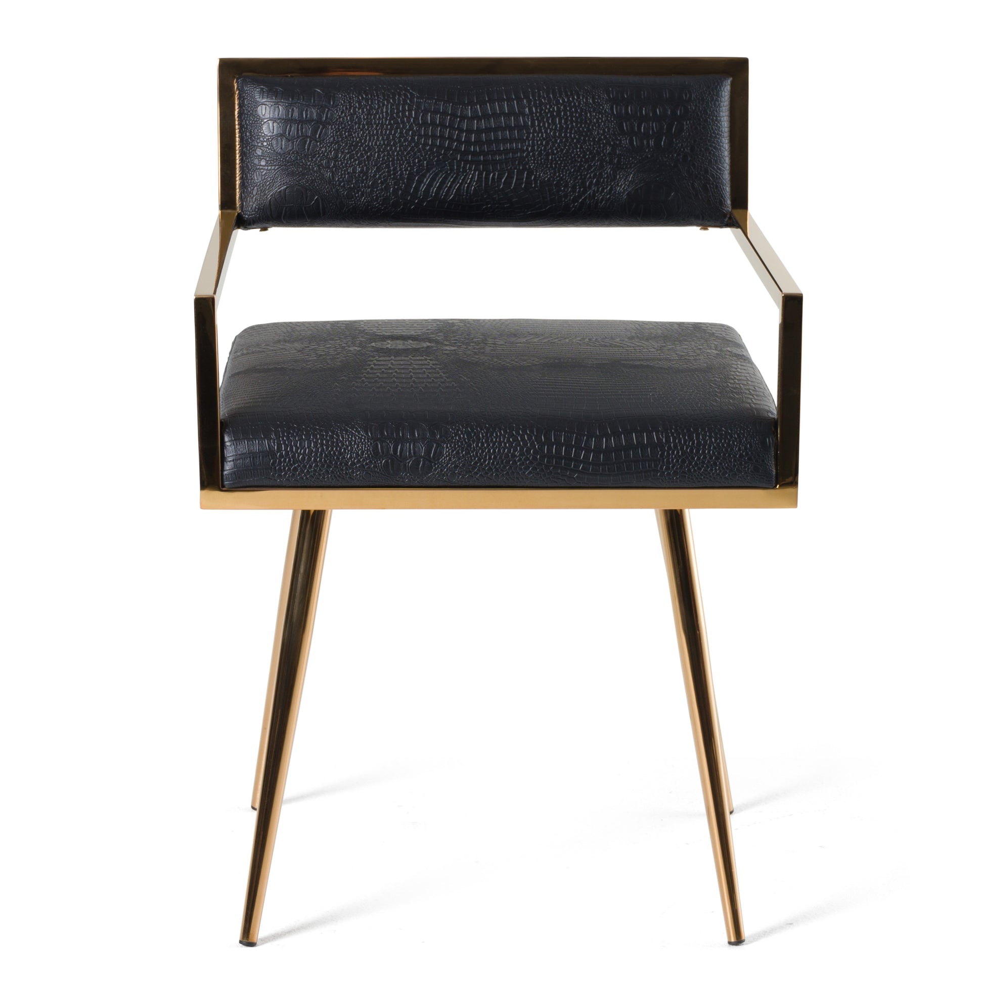 The Rosario Dining Chair is an uber stylish piece for your home. The rose gold frame wraps around every corner of the piece, encompassing all in its lovely coloring. Black crocodile upholstery stands out against the soft touch of the rose gold metal. Tapered rose gold legs finish this lovely piece, creating a stylish and versatile chair. This contemporary piece needs a place in your home.