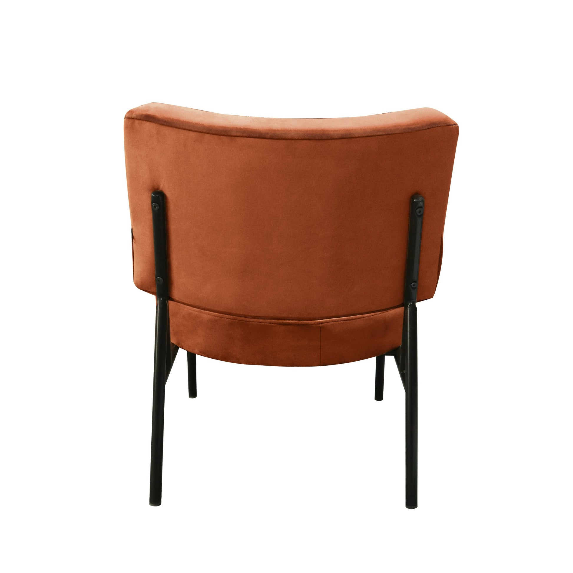 This Modrest accent chair is the perfect mid-century piece for your home. The Sami Accent Chair is upholstered in an orange velvet and has a round seat and rectangular backrest connected by a black metal tubular frame.