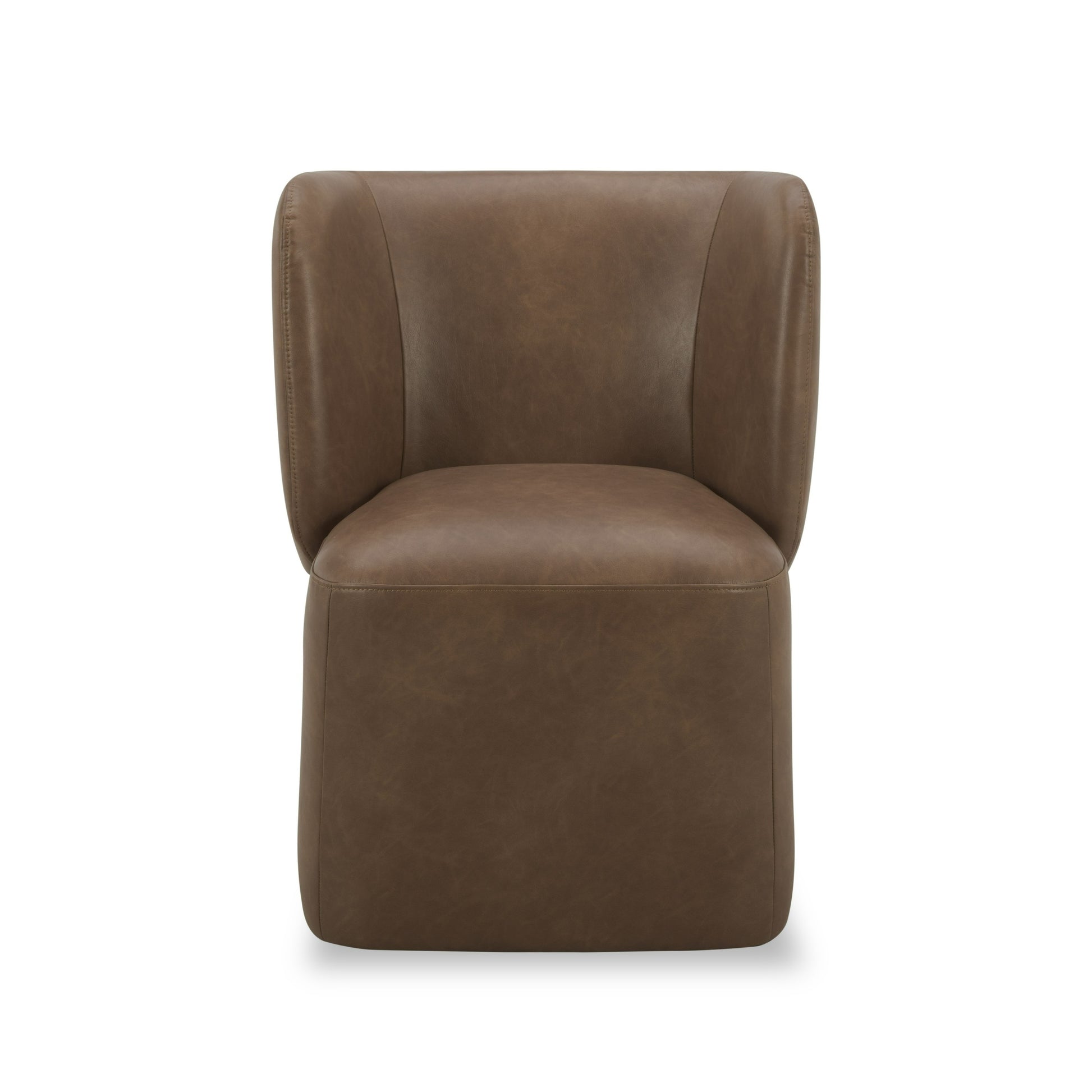 The Modrest Standing Modern Brown Vegan Leather Swivel Dining Chair embodies contemporary elegance with its sleek, rounded design. Upholstered in rich brown vegan leather, it offers a warm and inviting aesthetic, while the plush cushioning ensures comfort during mealtime. The swivel feature adds functionality, making it perfect for dining or casual gatherings. With its unique shape and soft, textured surface, this chair serves as a stylish accent in any dining area, seamlessly complementing modern decor.