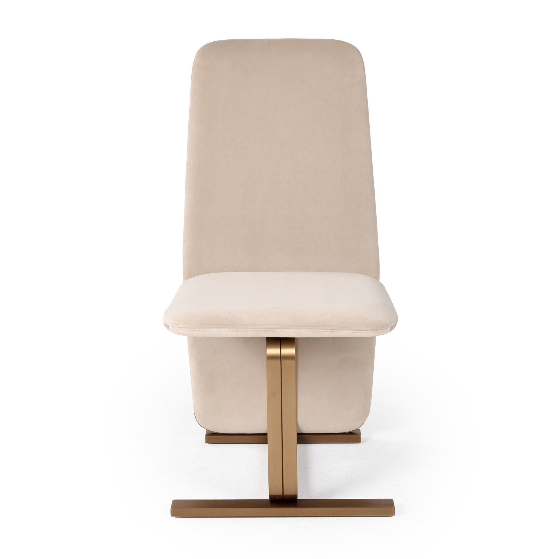 The Modrest Tasha Dining Chair Set combines modern elegance with comfort. Upholstered in luxurious light beige grey velvet fabric, these chairs exude sophistication. The brushed dark brass stainless steel base adds a touch of opulence, while the foam seat fill ensures a cozy dining experience. Plus, with no assembly required, you can enjoy these stylish chairs right away!