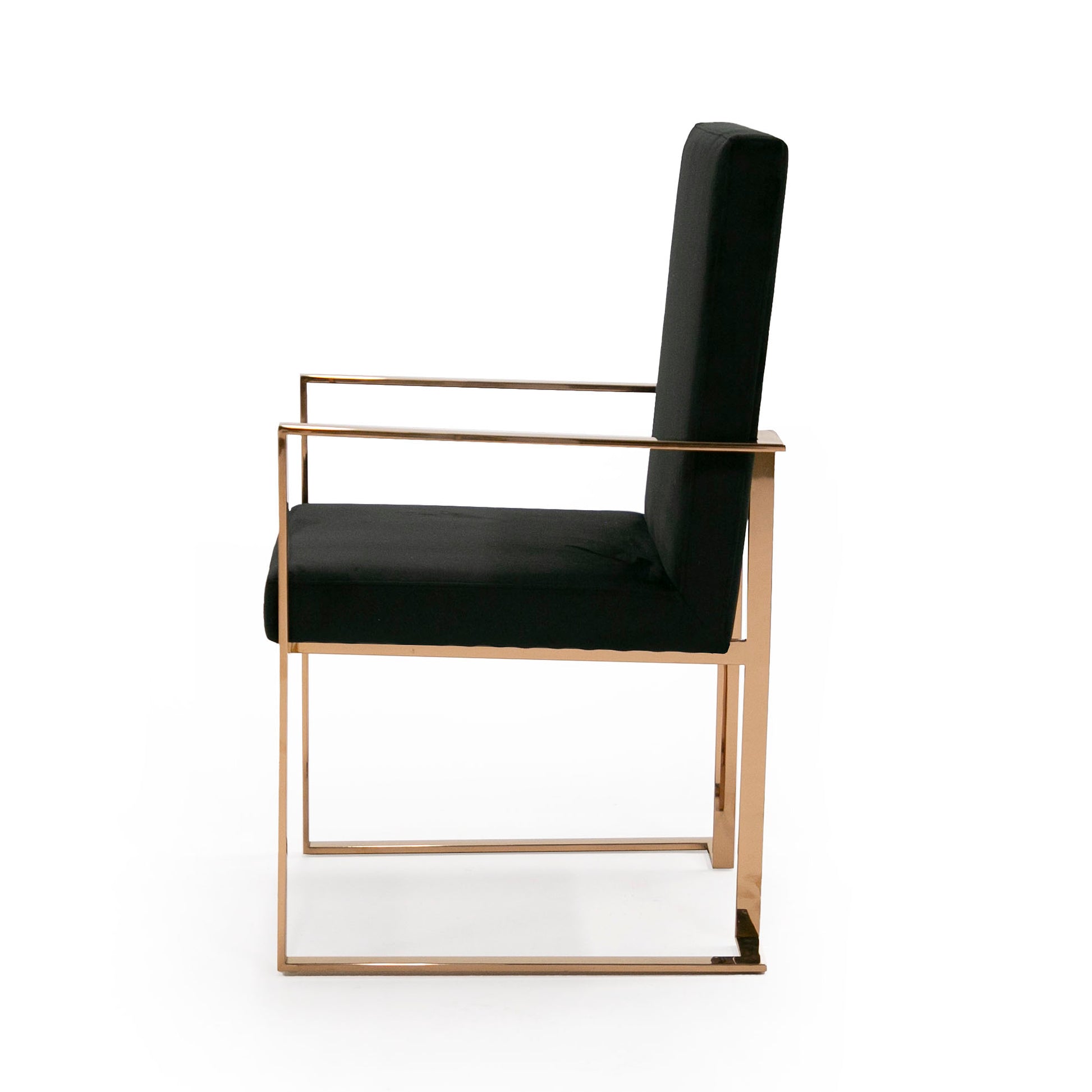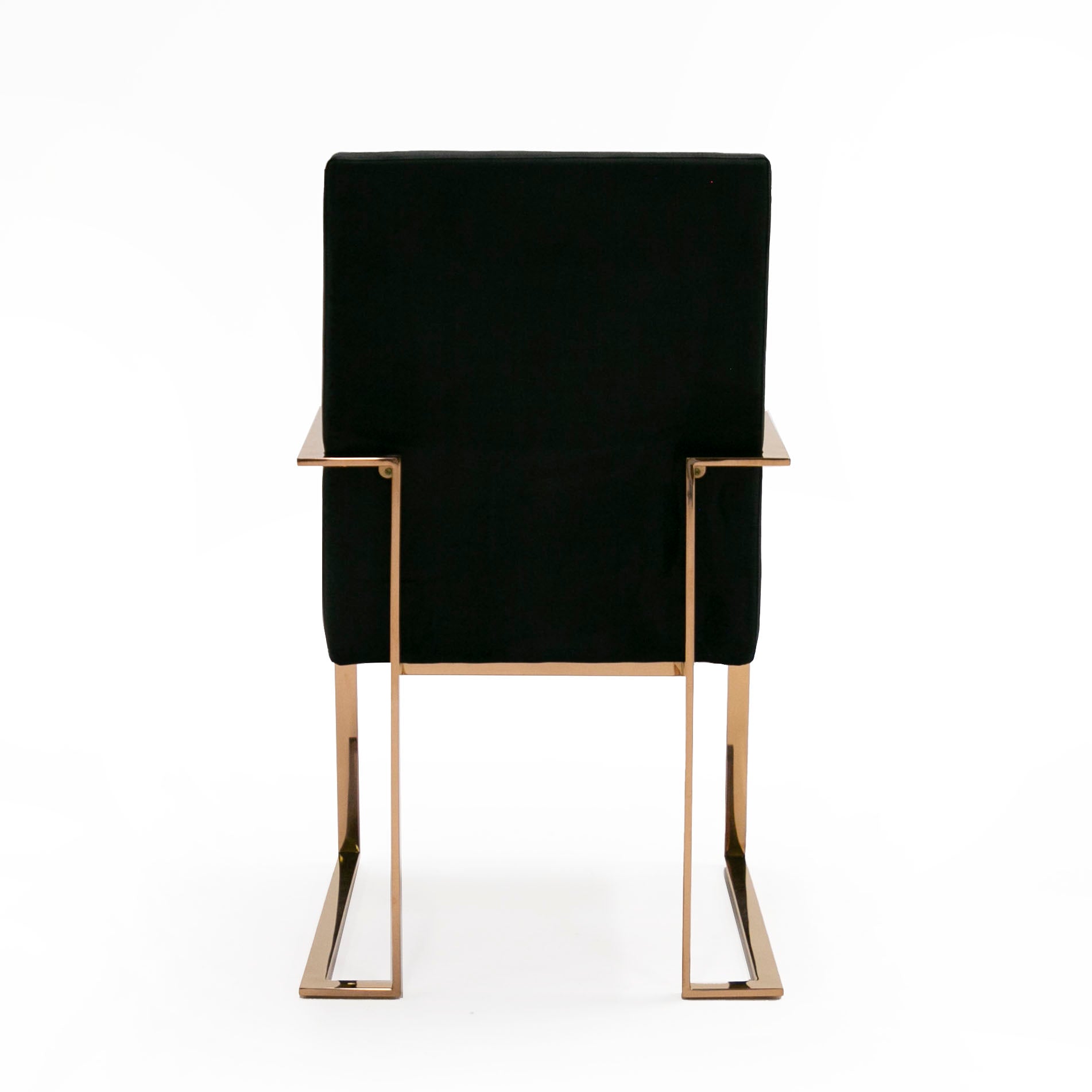 The Trea Dining Chair contrasts well with its soft-lined black velvet ergonomic seats scream comfort. The rose gold stainless steel frame holds a linear frame against the elegance of contrast in colors. This dining chair is perfect for a modern and sleek look.