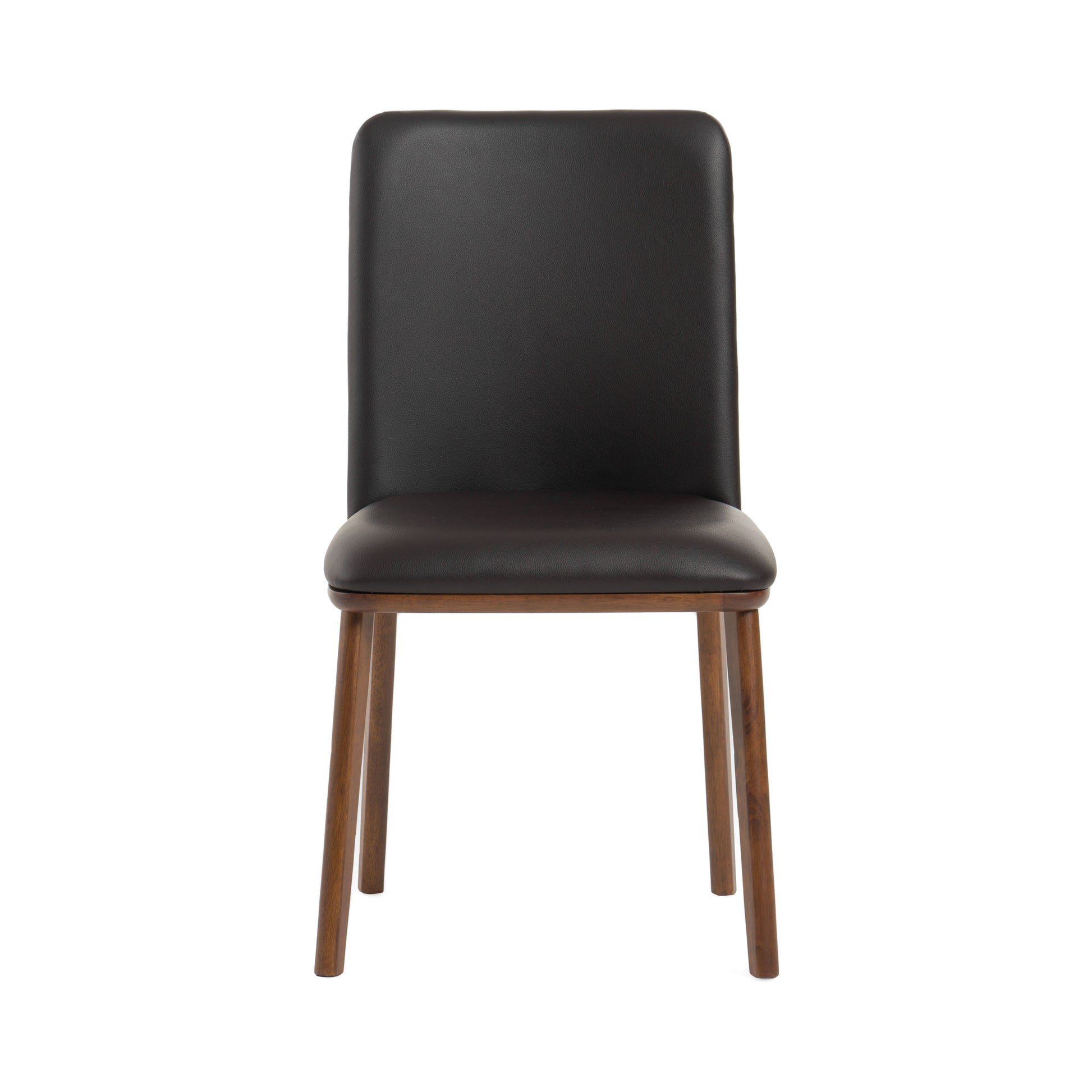 This modern walnut and brown eco-leather chair set features two dining room chairs. The chairs have solid rubberwood legs that have a walnut finish, and the seats feature a dark brown faux-leather upholstery. The chair backs feature a curved line, which can help provide back support.