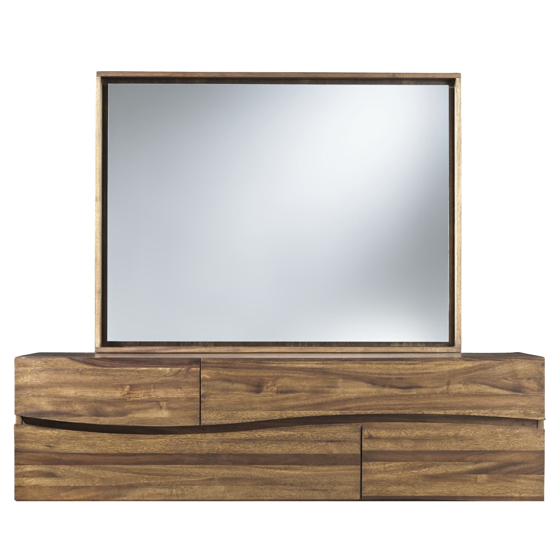 Inspired by modern California beach-chic, the Ocean collection is crafted from solid Sengon Tekik wood in a vibrant natural finish. Distinctive wave fronts provide the perfect canvas for hidden drawer pulls, which maintain the group's clean profile. The platform bed features a canted headboard and a wide platform frame.