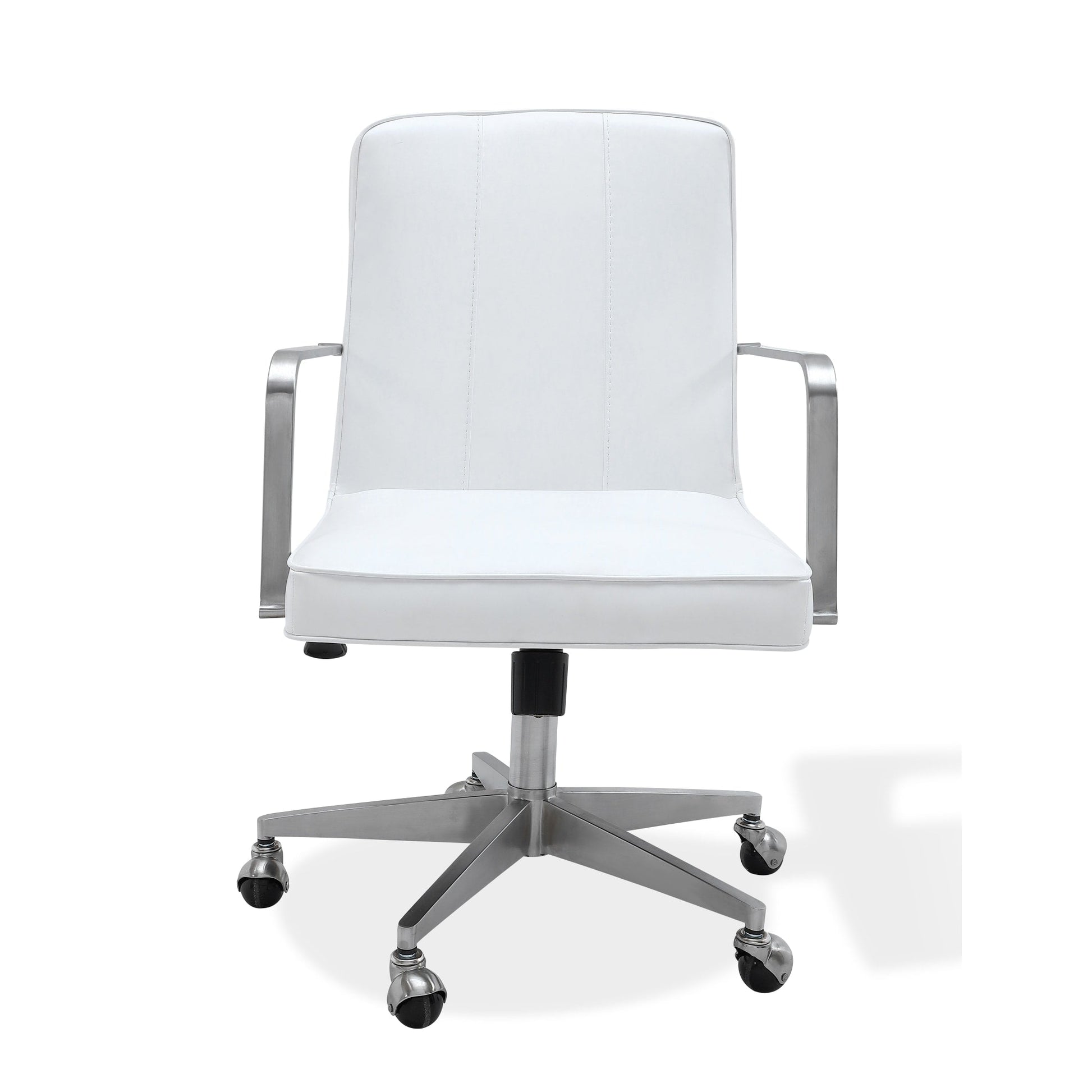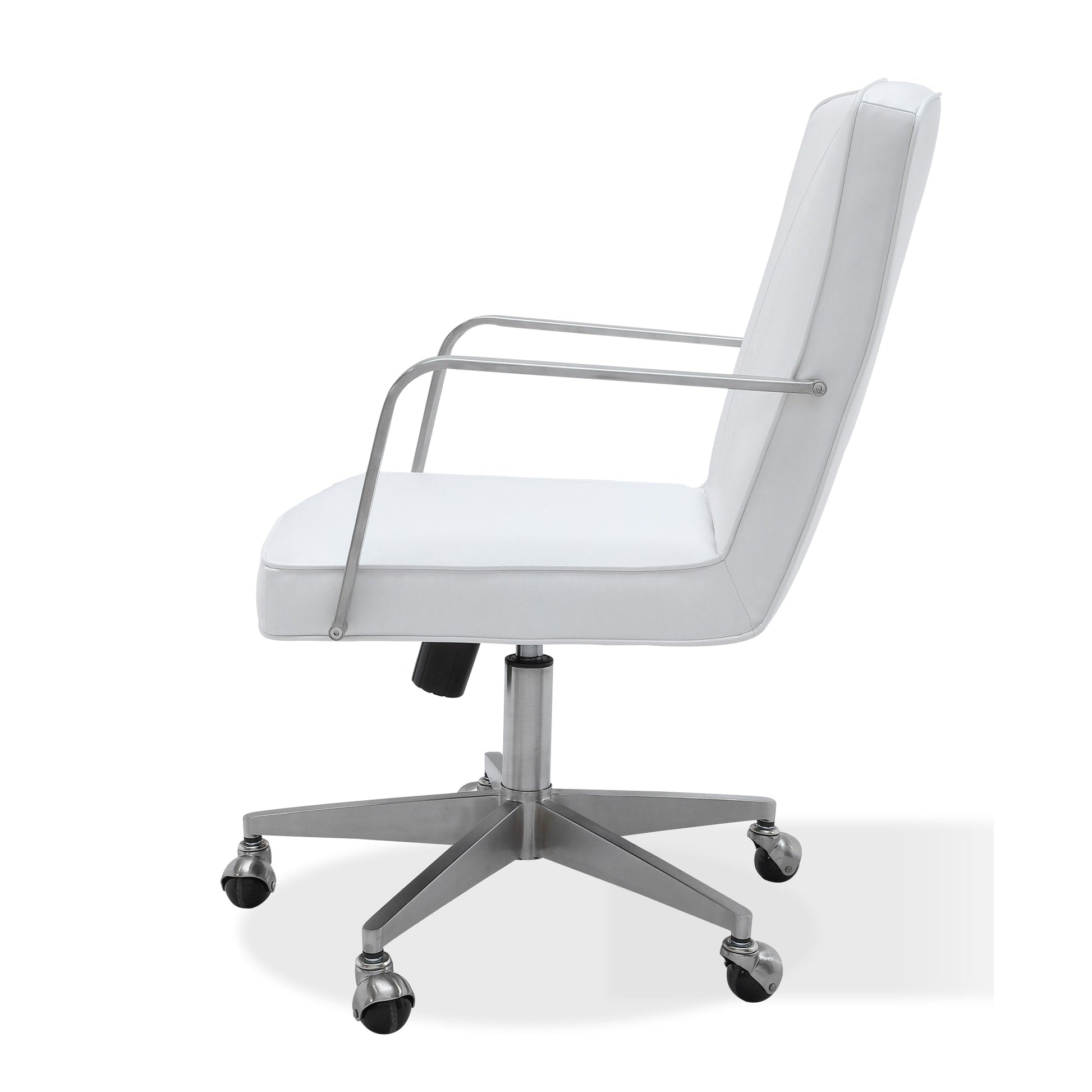 - Brushed stainless steel offers a soft luster against the white synthetic leather upholstery