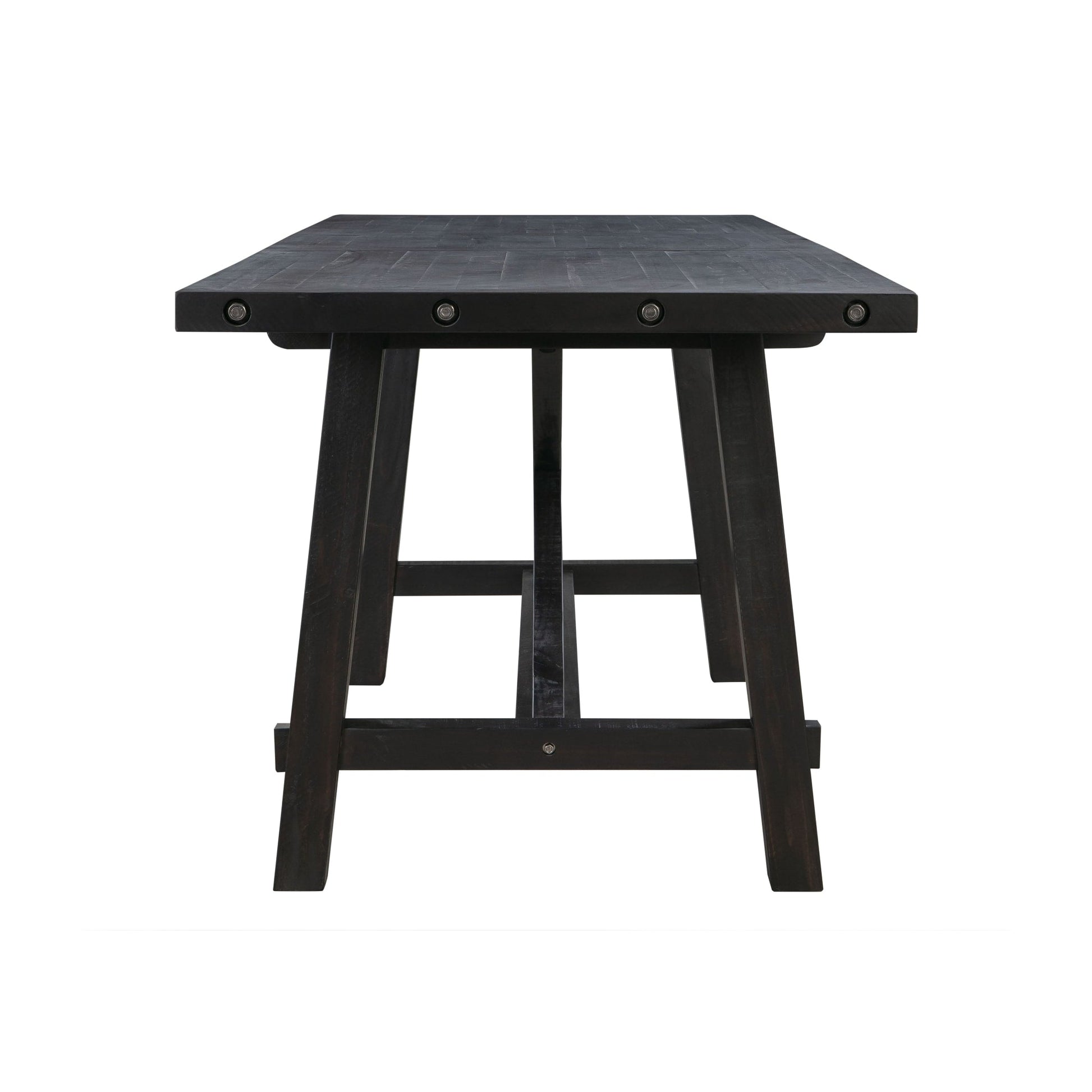 The Yosemite dining collection recreates the improvised, utilitarian look of early 20th century factory furniture. Rough-hewn planks crafted entirely from solid pine bear the characteristic saw marks, dents, pits, and random knots of logs milled on the steam-powered circular and sash saws of the era. A rustic black pine finish balances transparency and opacity to showcase these natural imperfections.