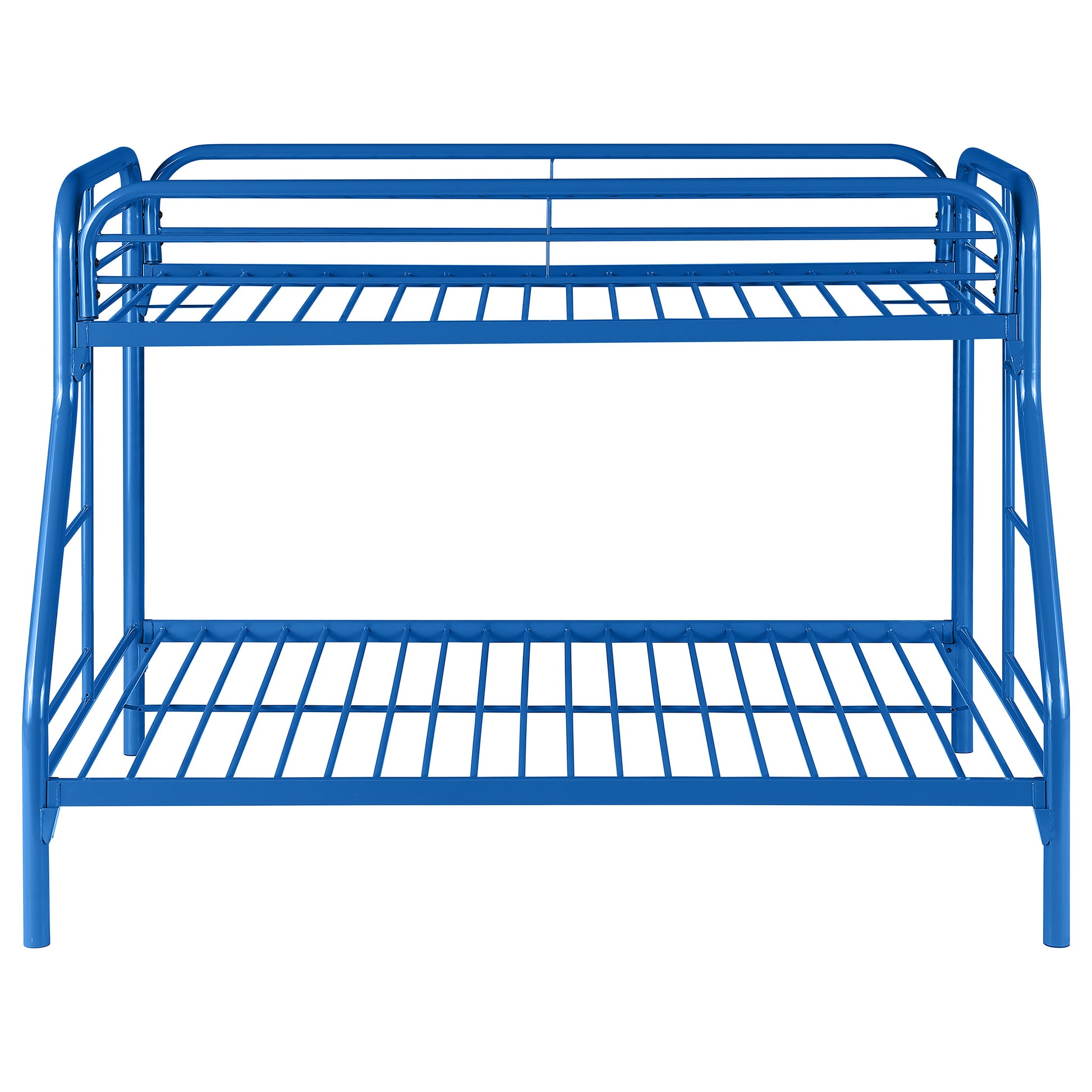 Add a vivid pop color to a child's room or guest room. With a sleek, metal frame in a cool blue finish, this bunk bed's frame is vibrant and whimsical. Its two mattresses are thick, luxe, and exquisitely plush. It's complete with a 20/20 piece slat kit for extra sturdy support. With a twin bed up top and a full-sized bed down below, this bed is perfect for kids and adults of all ages.