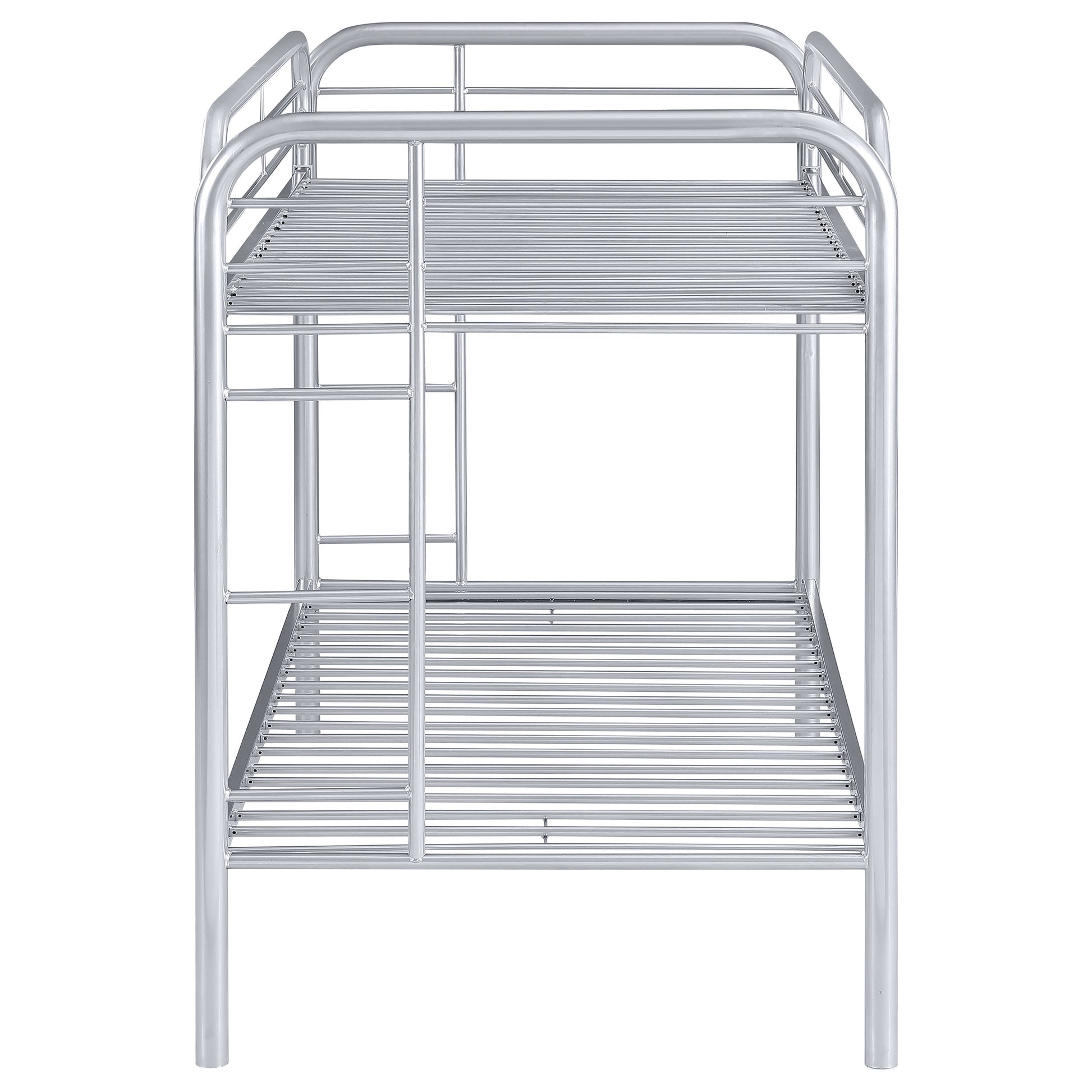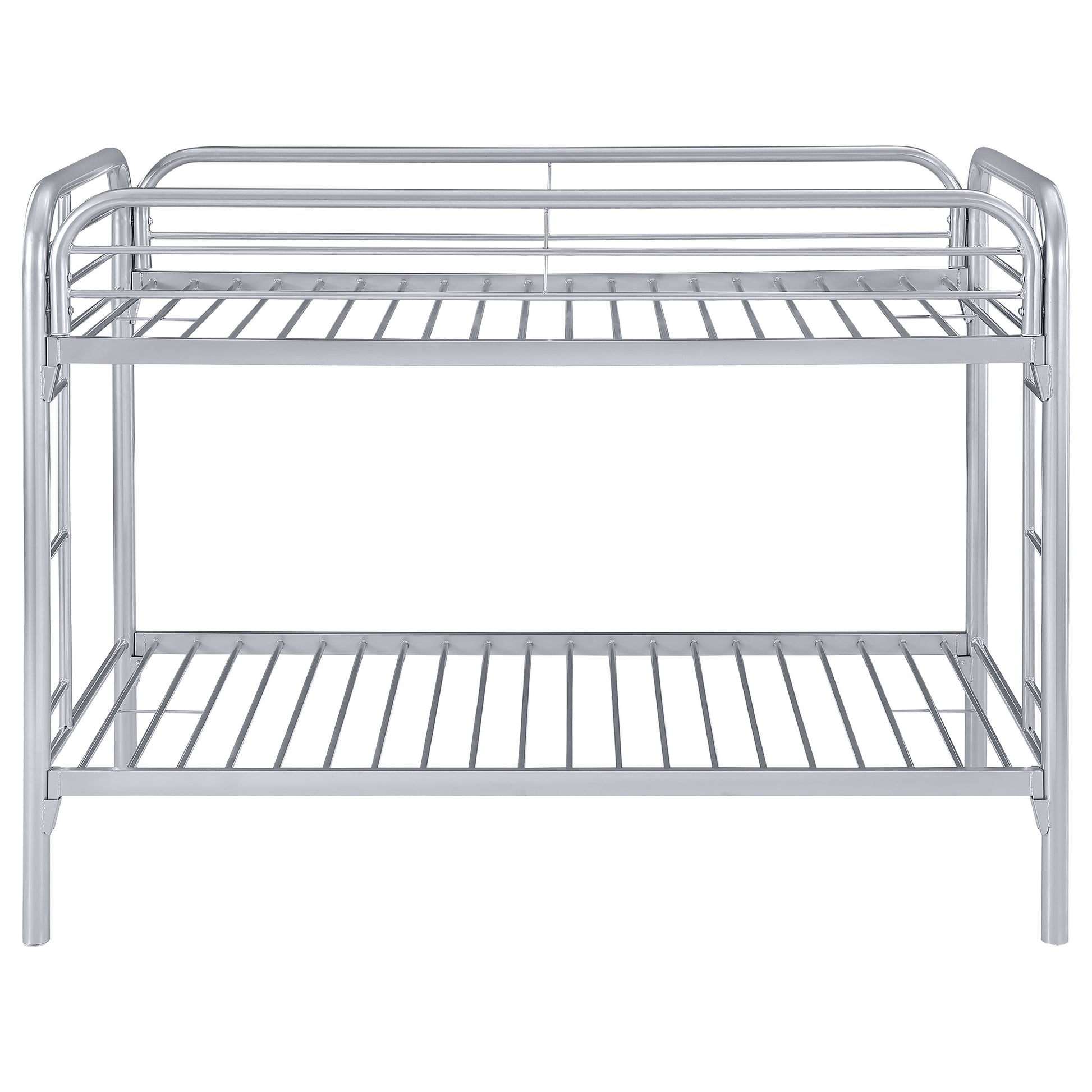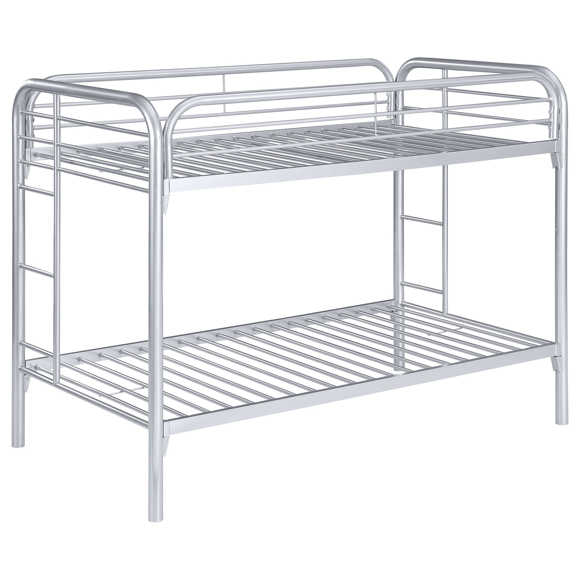 This bunk bed has youthful convenience and comfort. Top bunk has a slatted railing to ensure a safe, restful sleep. Each end features a ladder for easy up-and-down access. Metal frame is finished in lustrous silver for a contemporary ambiance. With a 20/20-piece slat kit included, this bed brings fun and luster to the bedroom.