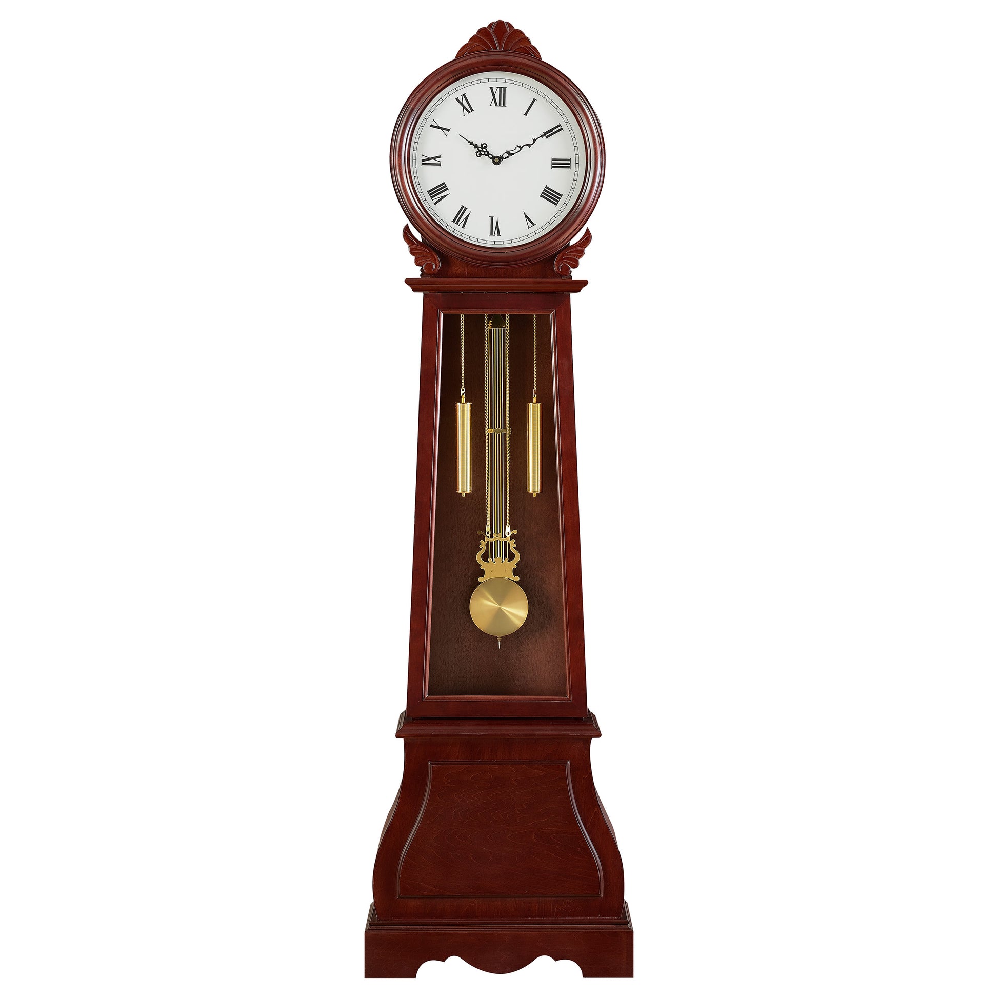 - Stately grandfather clock in brown red finish with gold finish details features striking bishop silhouette