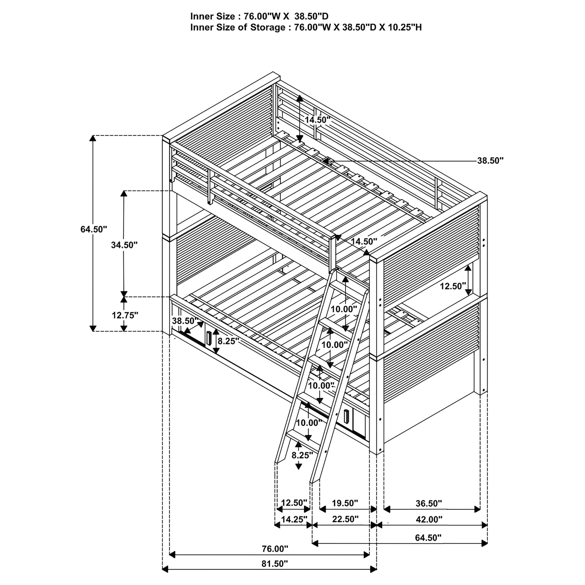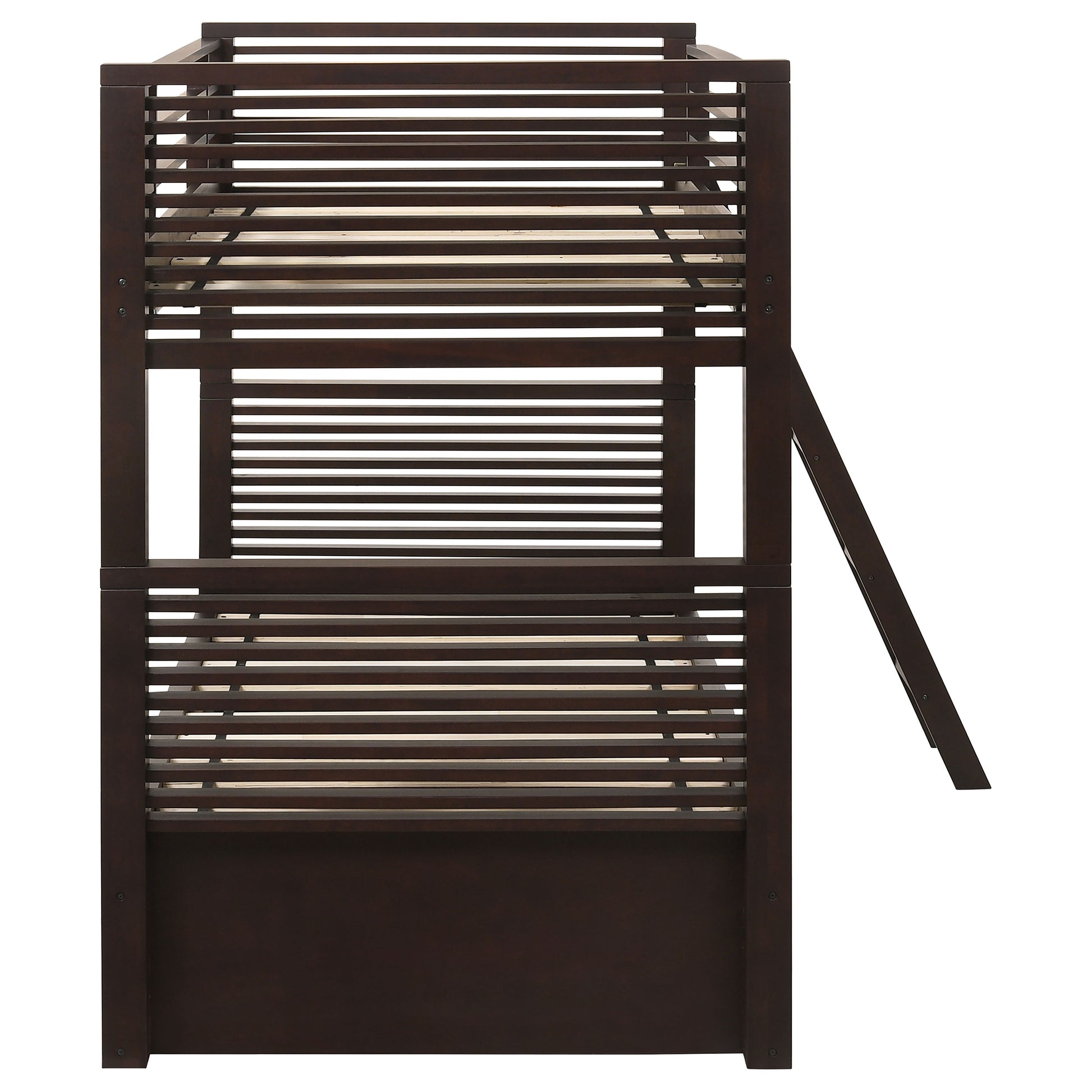 Clean lines and a minimalist aesthetic shine in this contemporary twin bunk bed. With a java finish and bright white cabinets along the base, this stacked twin over twin bunk bed provides a striking contrast and ample sleeping arrangements for a shared sibling bedroom. Sliding doors offer a sleek hidden storage compartment tucked beneath the bottom bunk where you can organize bed linens and other personal items. An attached ladder reaches the top bunk, where guardrails offer additional safety measures. Perfect for contemporary bedrooms, this stylish bunk bed frees up floor space for other bedroom essentials.