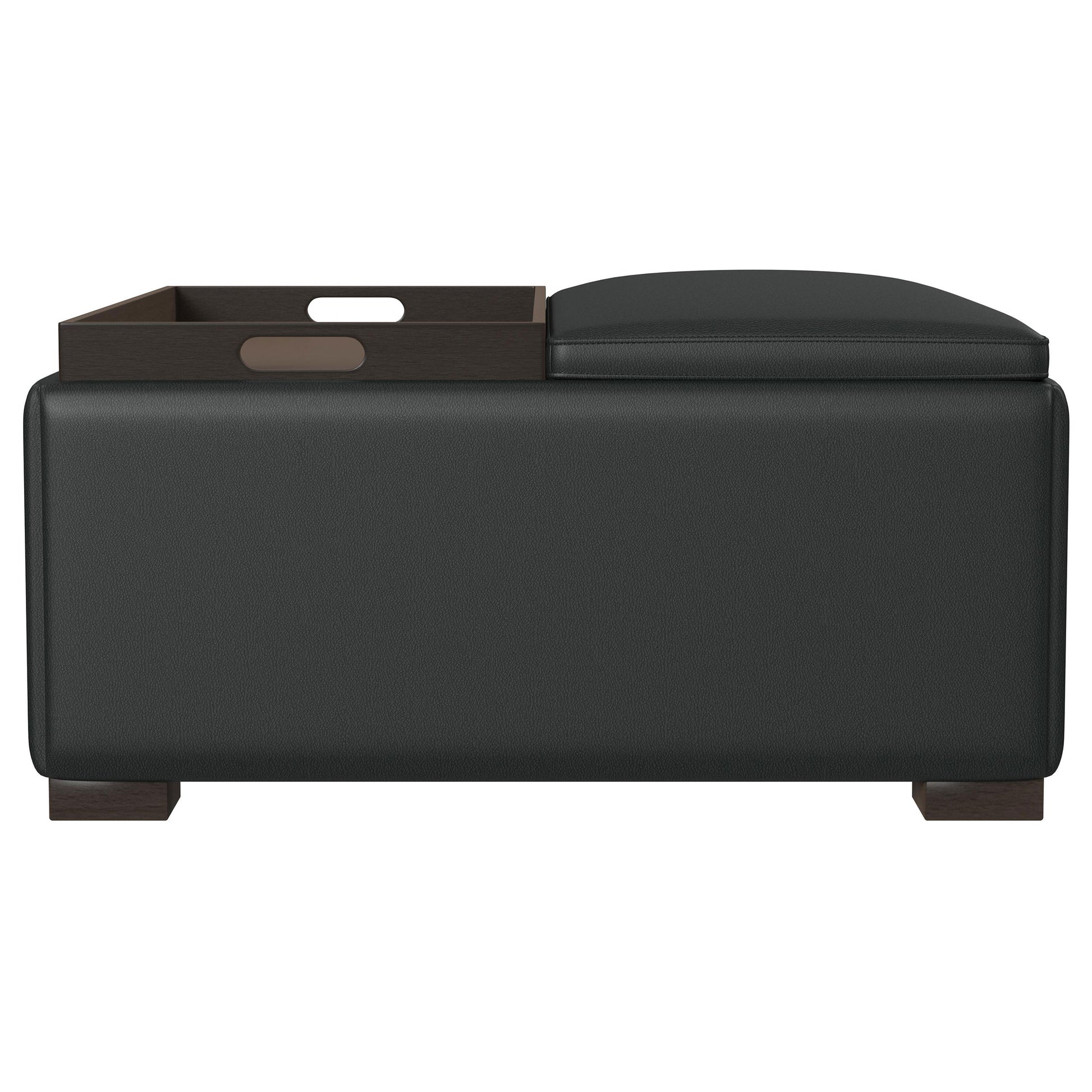 Introduce modern character in a stylish family room with the addition of an upholstered storage ottoman. It's designed to be multifunctional, complete with a padded seat that's split. The top reverses to offer a walnut finished tray for drinks and snacks, while the interior of the ottoman offers the perfect spot to stash blankets or board games. Its black faux leather upholstery is soft and neutral, sure to complement any palette. The walnut finished tray is complemented with matching walnut legs for a refined finishing touch.
