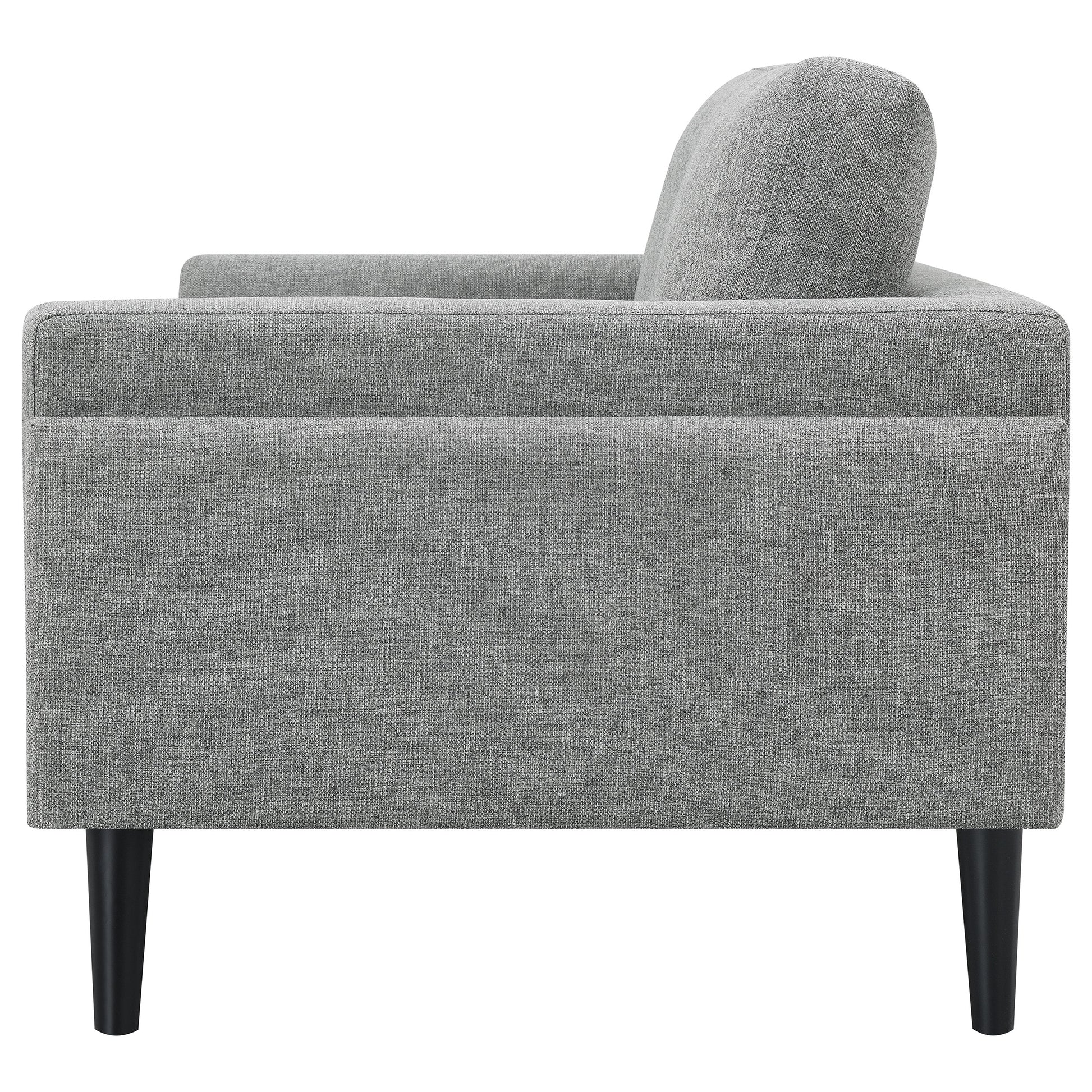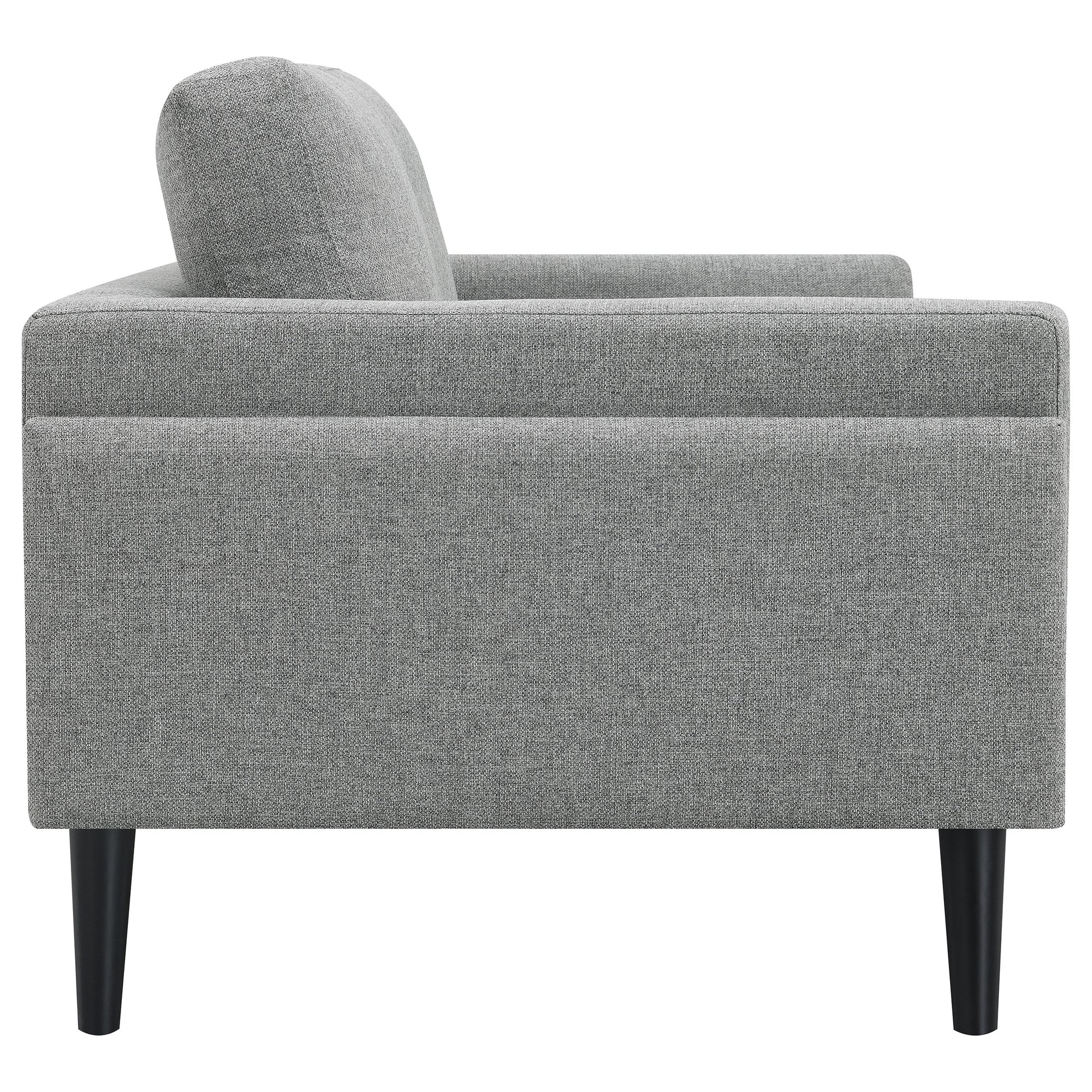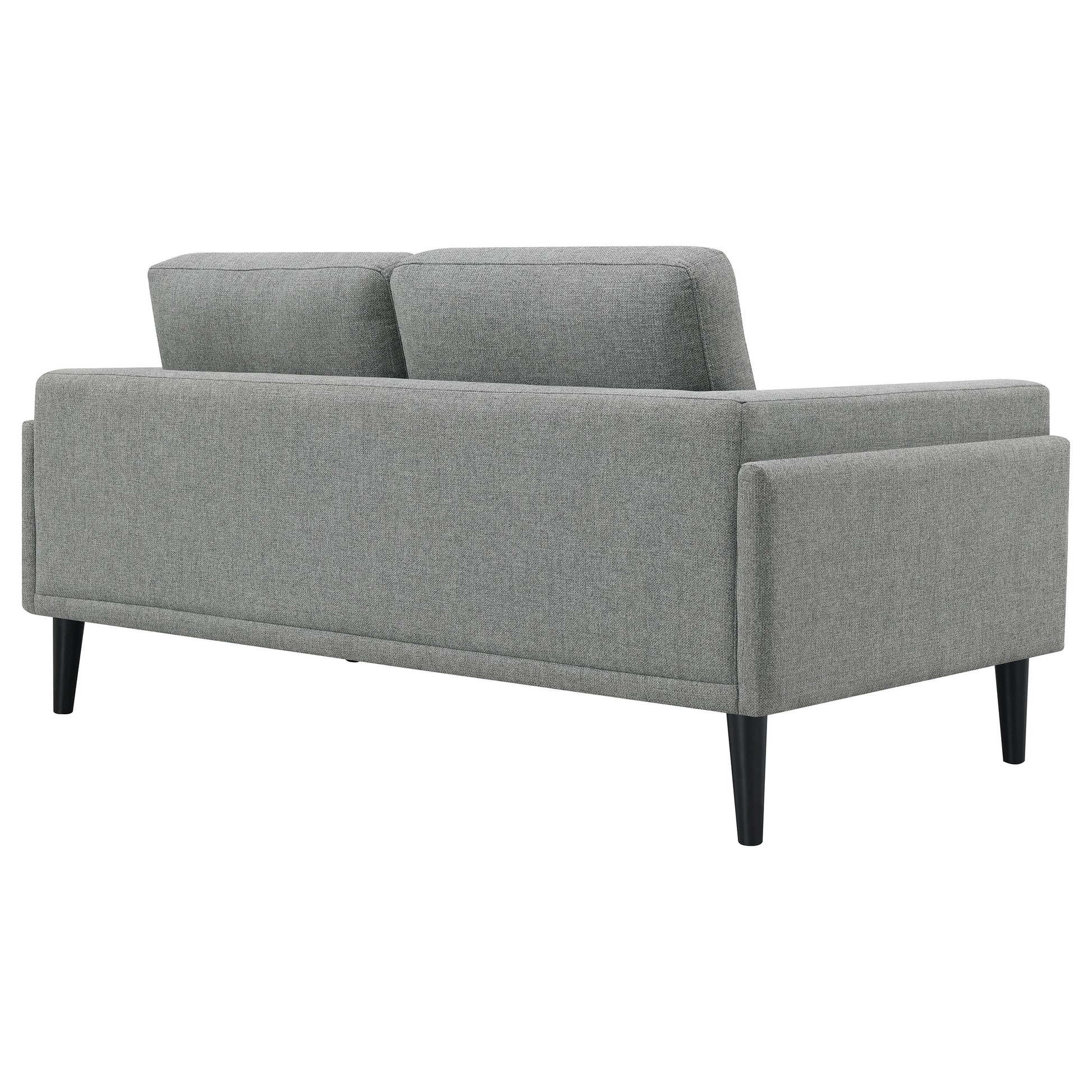 Unveiling our modern loveseat, where innovation meets elegance in a frame within a frame design. Adorned in a chic fabric, its streamlined silhouette is highlighted by meticulous topstitch details and track arms complemented by mitered front accents. Prioritizing comfort, the sofa comes with reversible back cushions and pocket coil seat construction, ensuring a snug and supportive seating experience. Anchored by tall, black cylinder-shaped wooden legs, this sofa stands as a blend of style and function, ready to be the centerpiece in any contemporary living space.