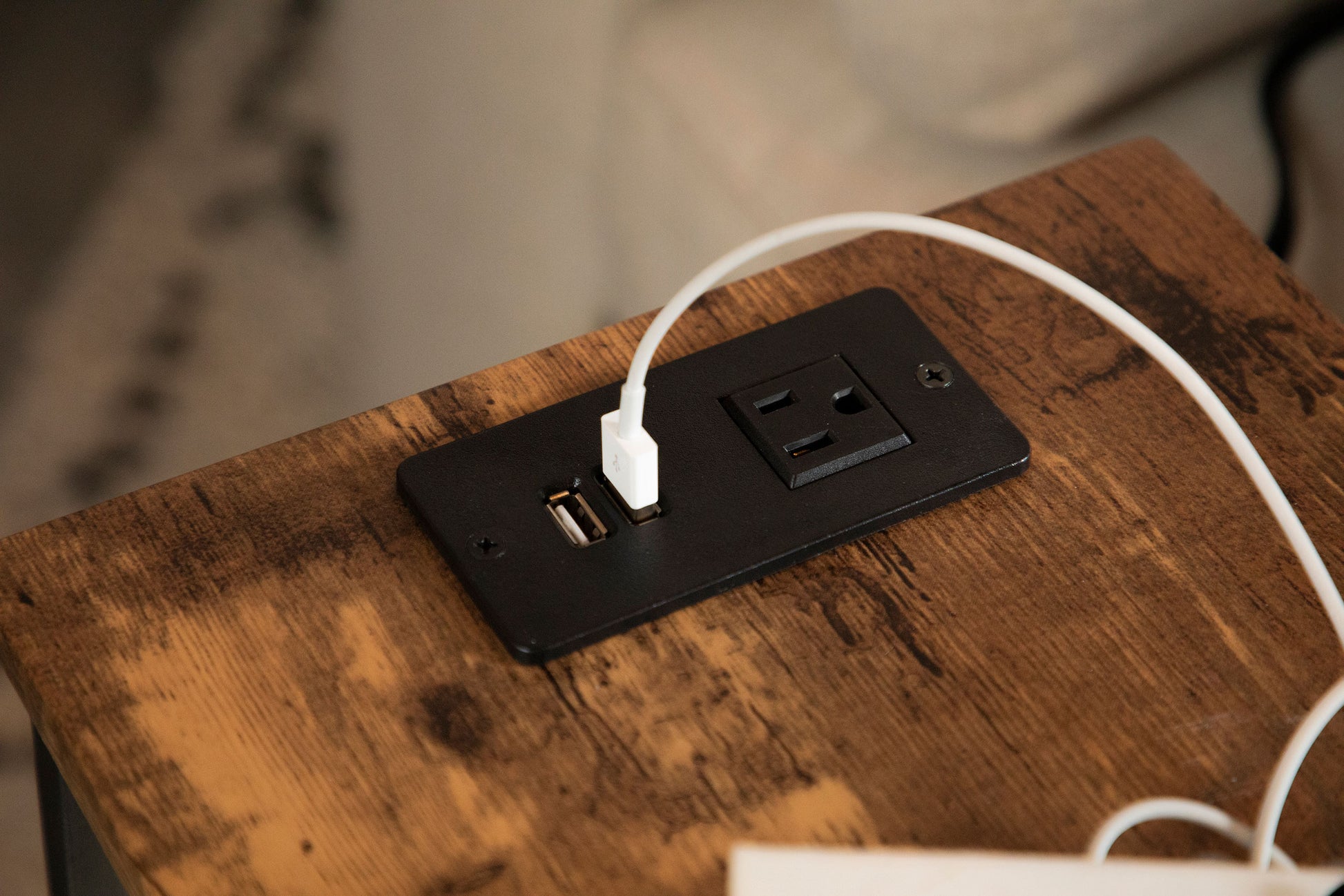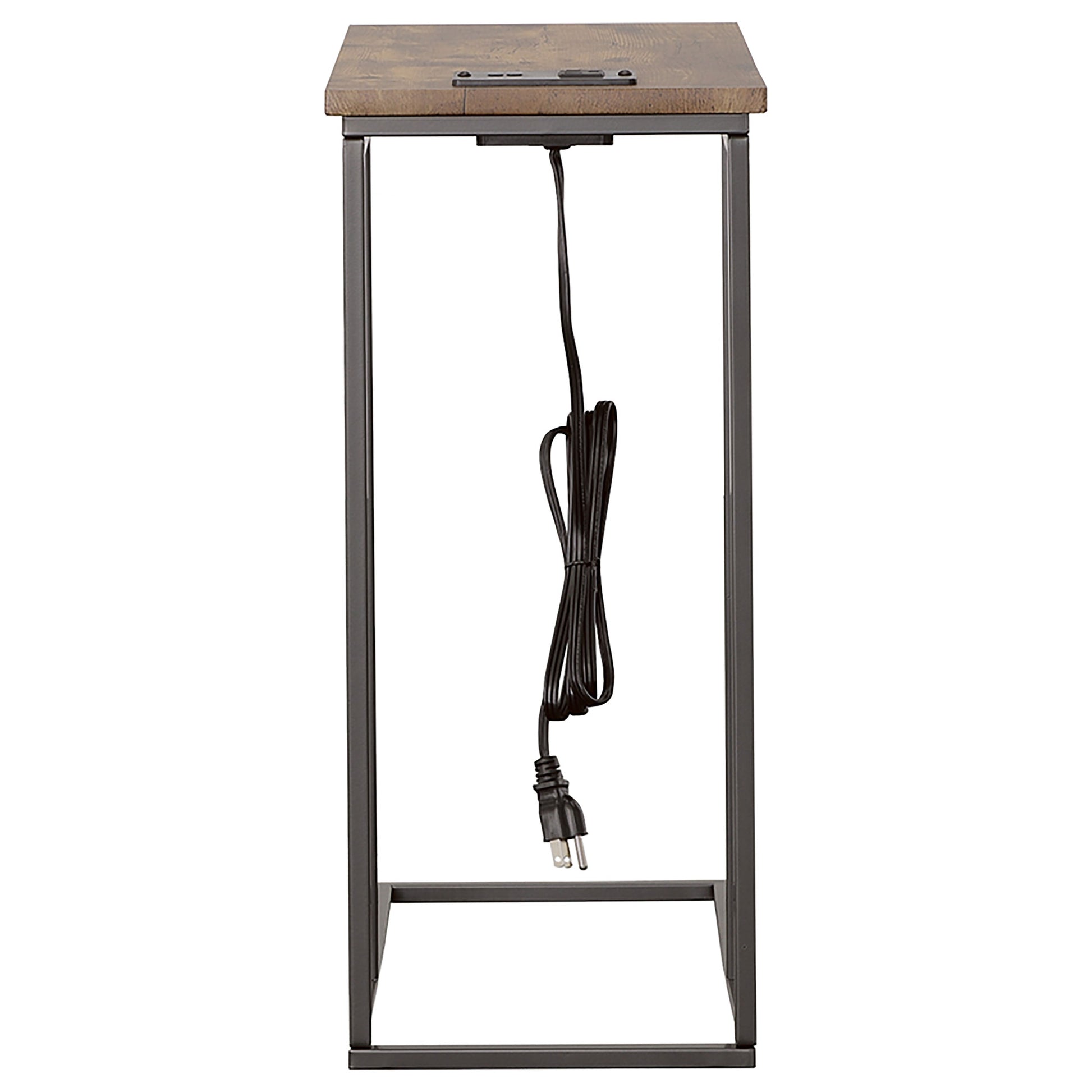 Keep a refreshment nearby with this industrial style snack table. Complete with an elongated tabletop and base, this accent table slides easily over the arm of a chair or your lap. Its mixed material design features an engineered veneer in a natural woodgrain, contrasted by a sleek, rail-like metal base and supports in a dark gunmetal grey finish. In addition, this table offers two built-in USB ports and one power port for convenience. Place this snack table next to a corner accent chair to provide table space in a compact room.