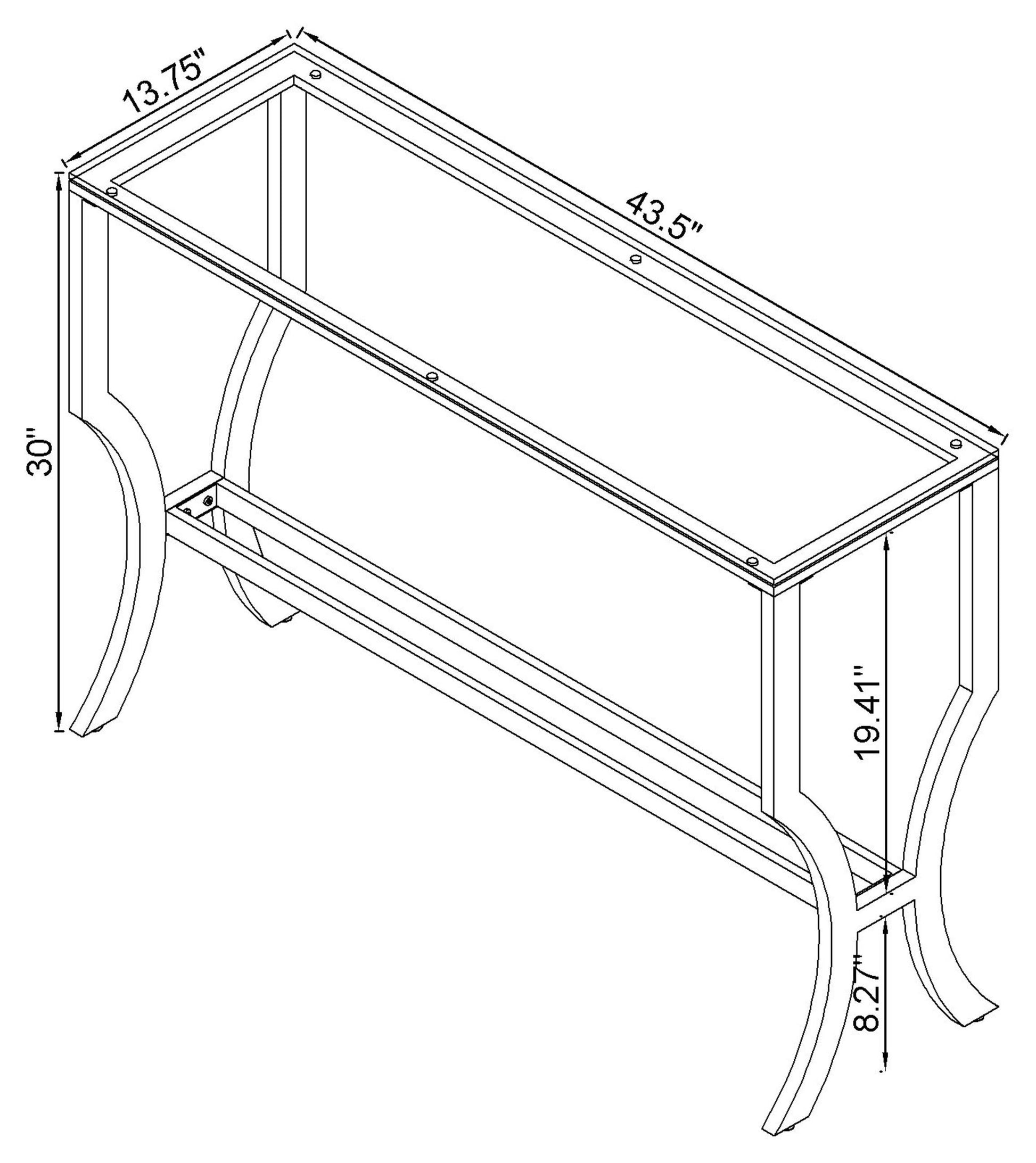 Extend a glamorous motif throughout an entryway with the charming radiance from this chrome sofa table. Elongated in silhouette, the rectangular glass top is great for adding an open and airy feel. The bright and reflective shine of metallic bliss gives this modern piece its chic personality. Delicately curved, the hourglass-inspired silhouette of the legs welcomes a feminine French-inspired feel. Add structure with the built-in storage shelf featuring mirrored details.