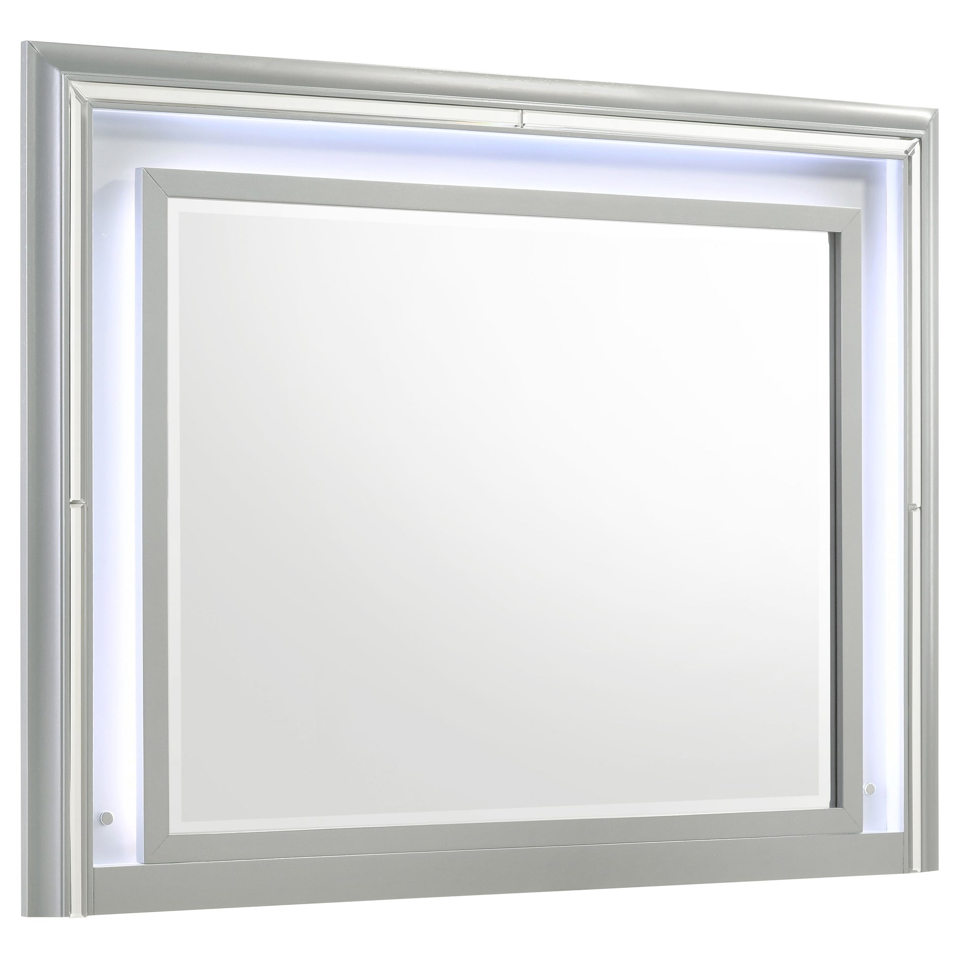 Completely reimagine your bedroom with the modern glam energy of a contemporary five-piece bedroom set that includes LED lighting in both the bed and the dresser mirror. A light silver finish wood grain finish gleams in the light, while the headboard of the bed features snow white fabric that offers a touch of warmth to contrast the silver. The bed offers a pair of drawers in the footboard, offering additional storage perfect for linens and seasonal accessories. Chevron details in the headboard are echoed in the jeweled V0shaped pulls decorating each drawer front. Turned feet accentuate each piece, while the dresser, chest, and nightstand deliver abundant storage options to keep your bedroom tidy or organized.